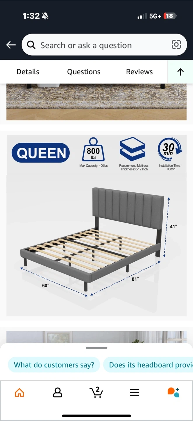 Modern platform bed frame with a grey upholstered headboard and footboard. This queen-sized frame comes with memory foam mattress. Easy to assemble.