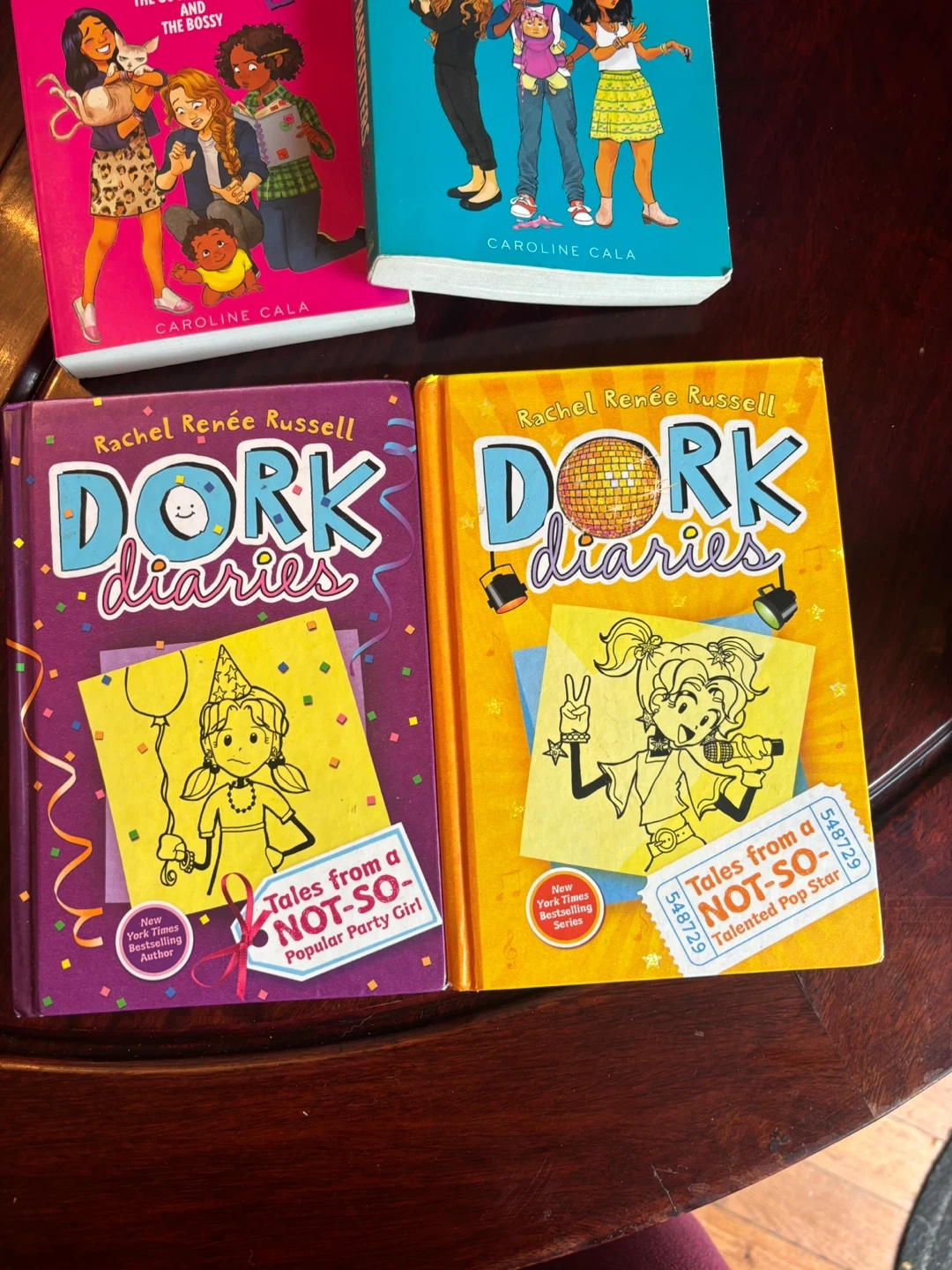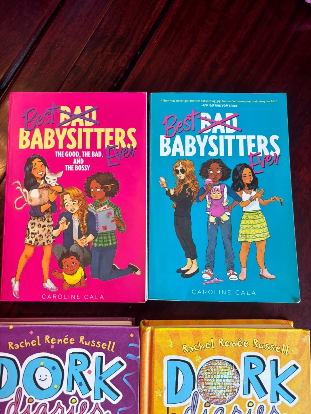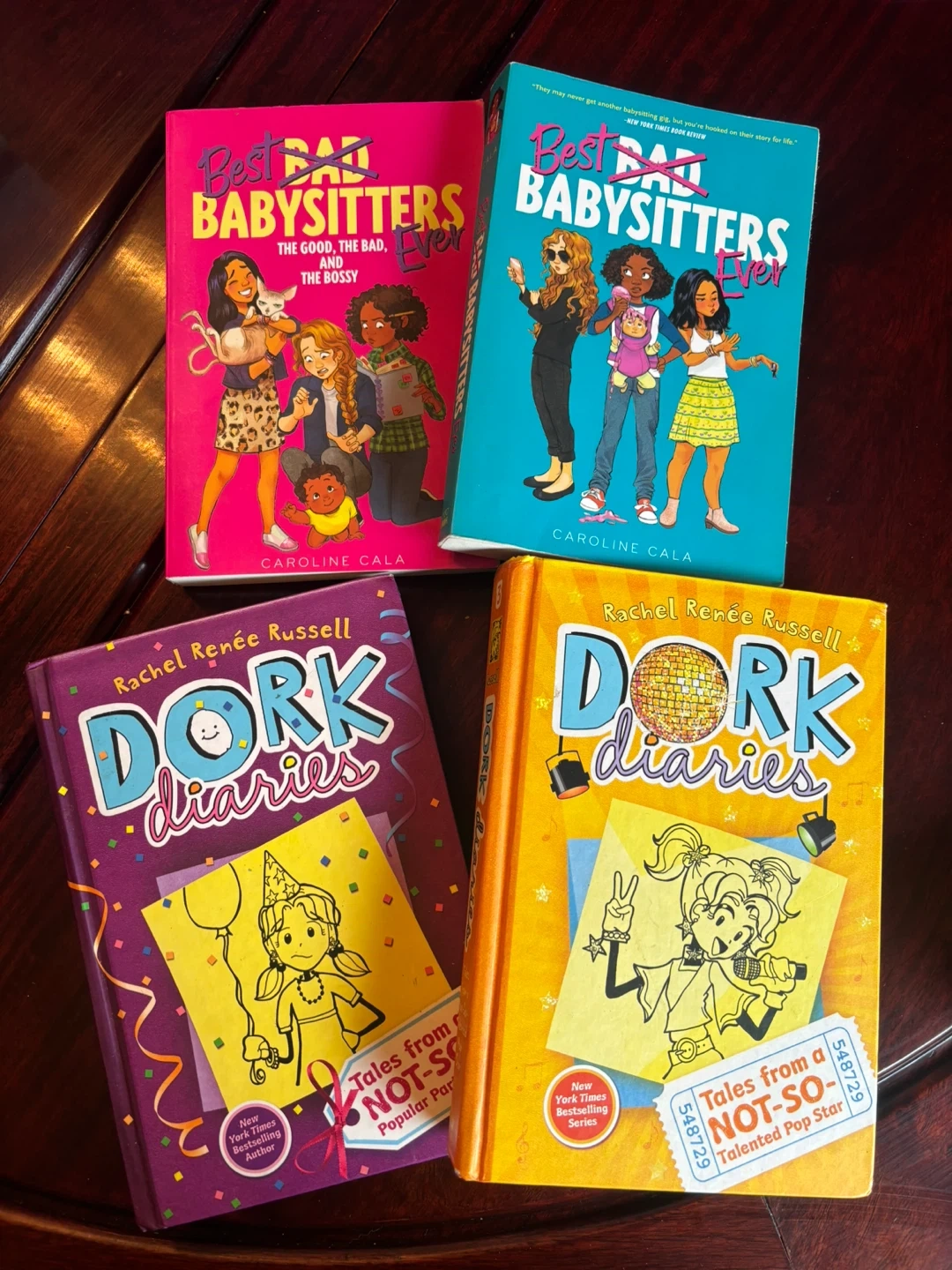 Includes two 'Best Babysitters Ever' books by Caroline Cala and two 'Dork Diaries' books by Rachel Renee Russell. Great for young readers! These are chapter books with engaging stories.
