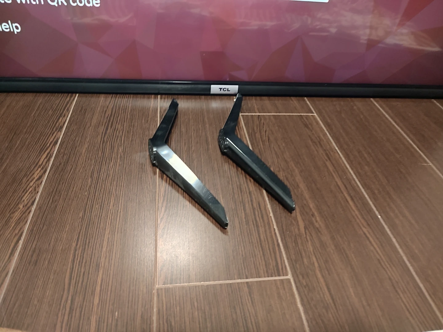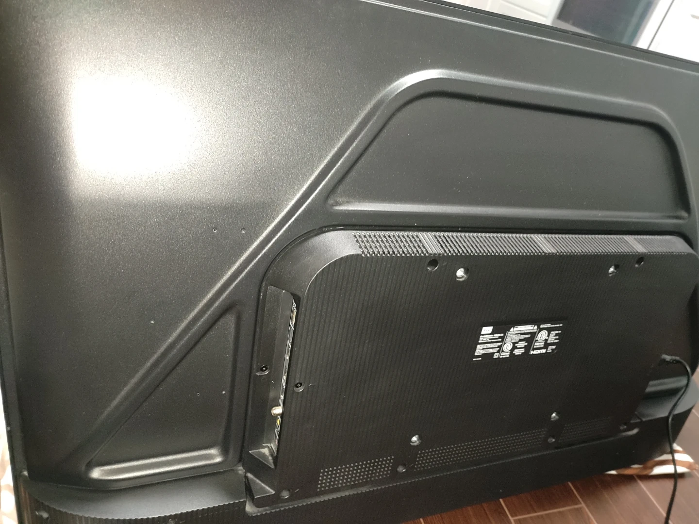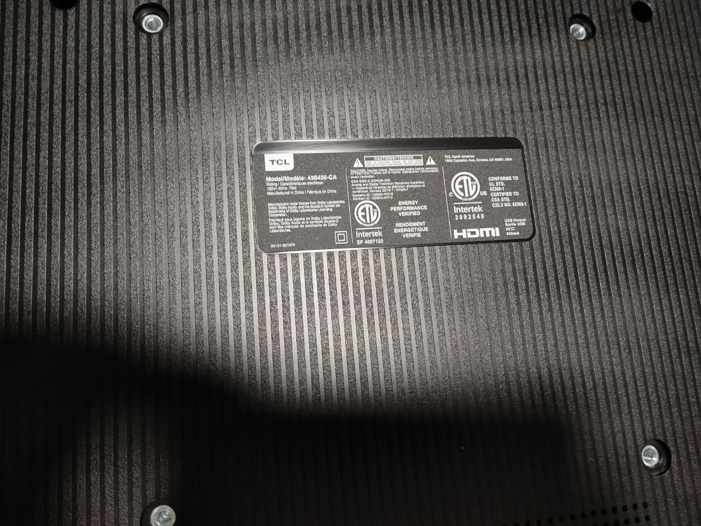 Powers on and works great, Just took pics during initial setup. Model is 43S435-CA. Comes with the stand feet. Has Roku smart TV features built in.