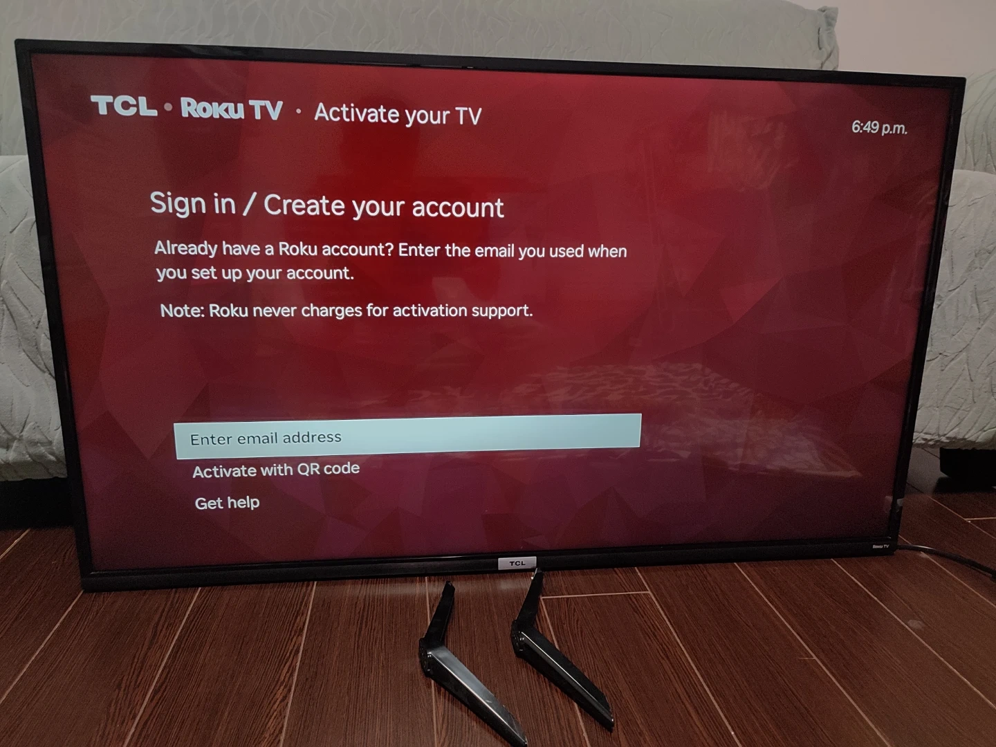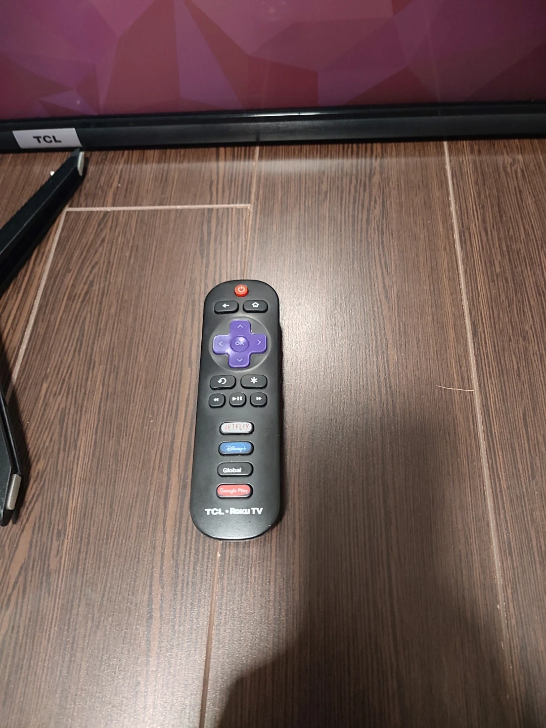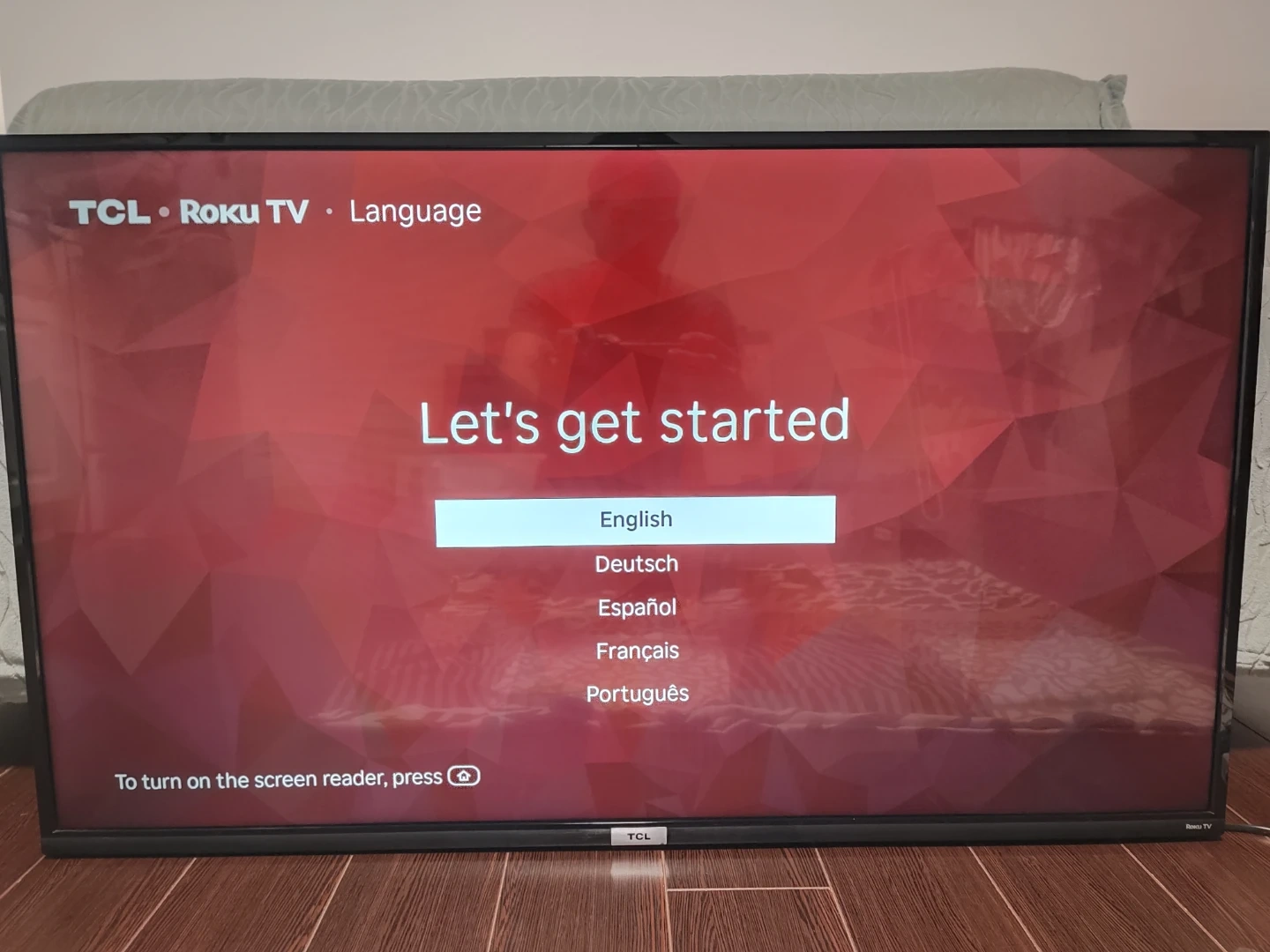 Powers on and works great, Just took pics during initial setup. Model is 43S435-CA. Comes with the stand feet. Has Roku smart TV features built in.