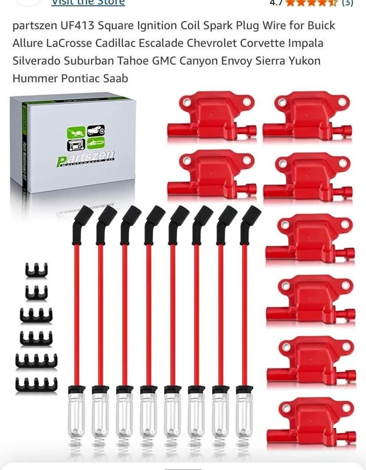 Brand: partszen. Item weight: 2.84 Kilograms. Cable type: spark plug wire. Connector type: Boot, Spade. Wire diameter: 7 Millimeters. Replaces Part Number: 12570616, UF413, E893, D510C, UF-413, 12611424, 12192195, 9748GG, 748GG, 12622553, 88862397, 12192192, 748UU, 12656210. Fit for Buick Allure 2008, LaCrosse 2008-2009, Rainier 2006-2007; Cadillac CTS 2006-2015, Escalade 2007-2016, Escalade ESV 2007-2016, Escalade EXT 2007-2013; Chevrolet Camaro 2010-2015, Colorado 2009-2012, Corvette 2005-2013, Impala 2006-2009, Monte Carlo 2007, Silverado 1500 2007-2013, Silverado 2500HD 2008-2016, Silverado 3500HD 2008-2016, Suburban 1500 2007-2014, Suburban 2500 2007-2013, Tahoe 2007-2015, Trailblazer 2006-2009; GMC Canyon 2009-2012, Envoy 2005-2009, Sierra 1500 2007-2013, Sierra 2500HD 2008-2016, Sierra 3500HD 2008-2015, Yukon 2007-2014, Yukon XL 2007-2013; Hummer 2008-2010; Pontiac GTO 2005-2006, Grand Prix 2006-2008; Saab 2005-2009. Package Includes: 8x Ignition coils, 8x Spark Plug Wires with Heat Shields, 6x Spark Plug Wire Separators. You will get what is pictured.