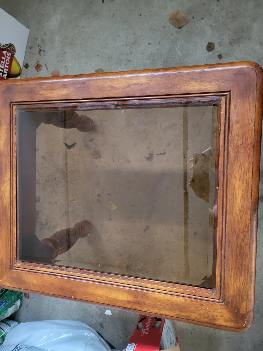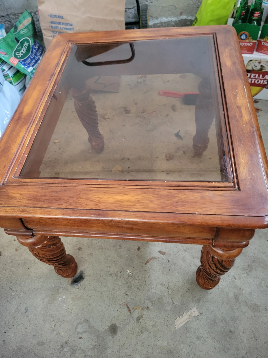 Weston Rutherford pickup Selling a wood coffee table with a glass top. It has a beautiful wood finish. The table has some wear and tear, but it's still in good condition and would look great in any living room!