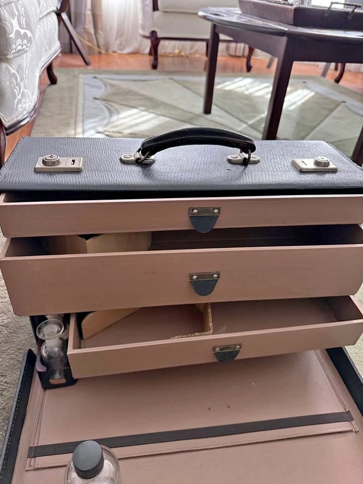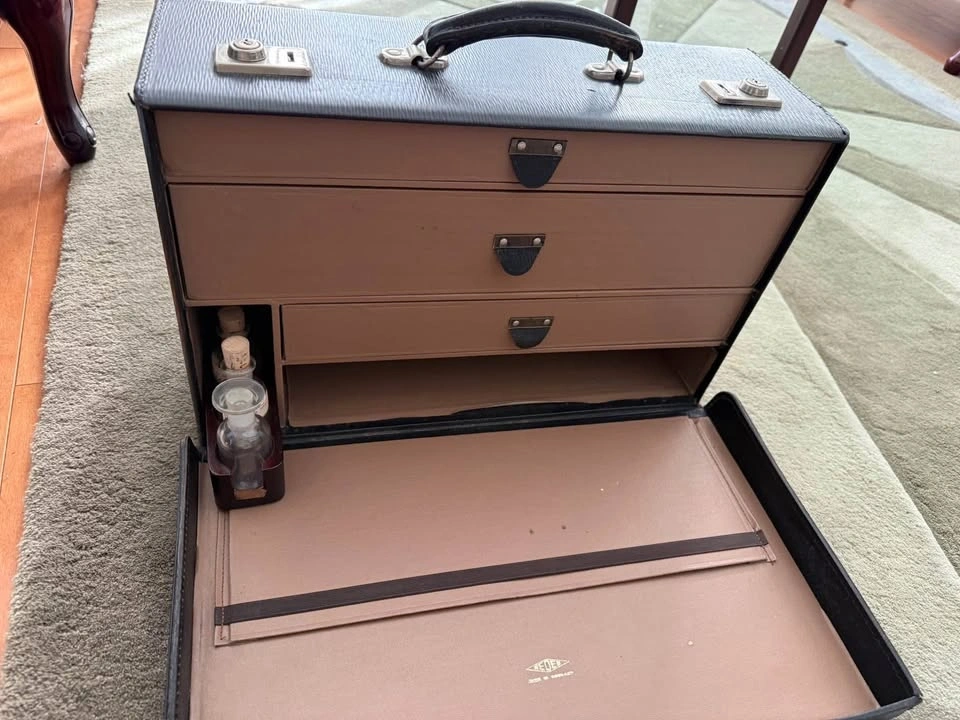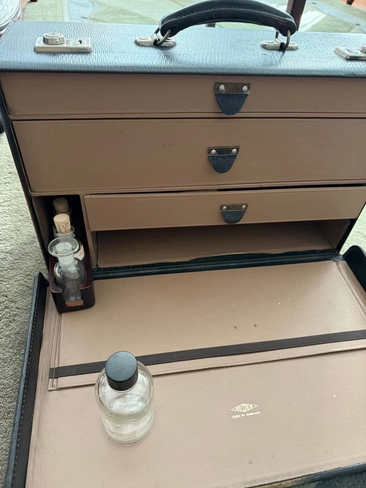 Selling a doctor medicine briefcase in very good condition. Comes with bottles as pictured. This is about 74 years old and includes a set of keys.