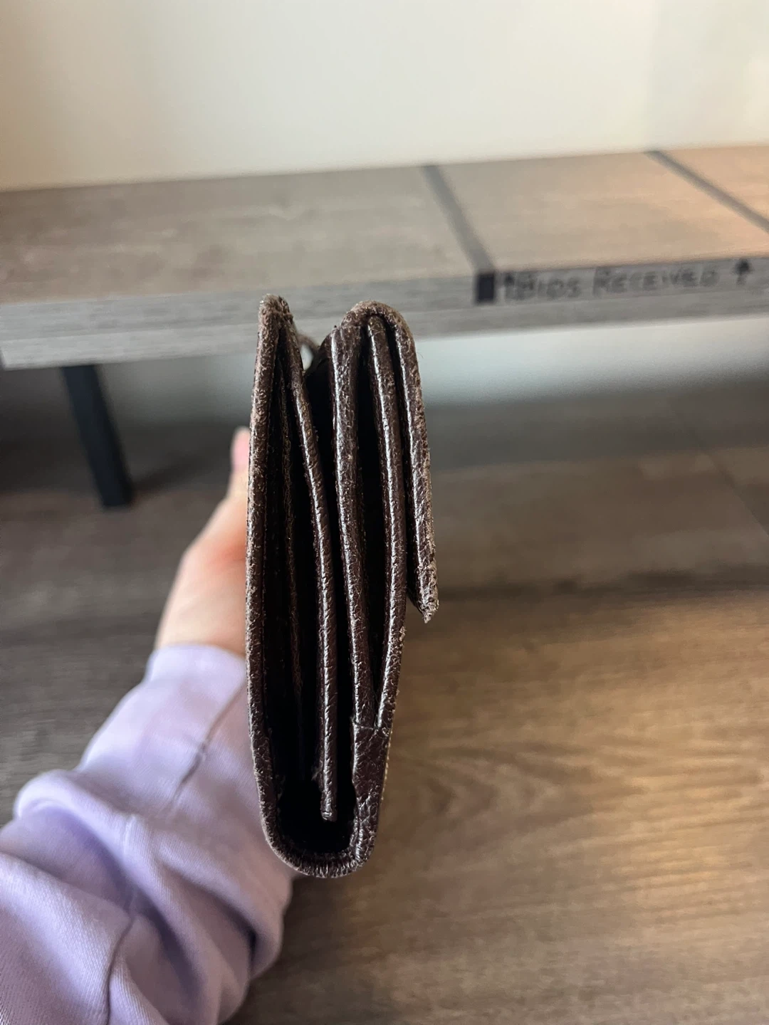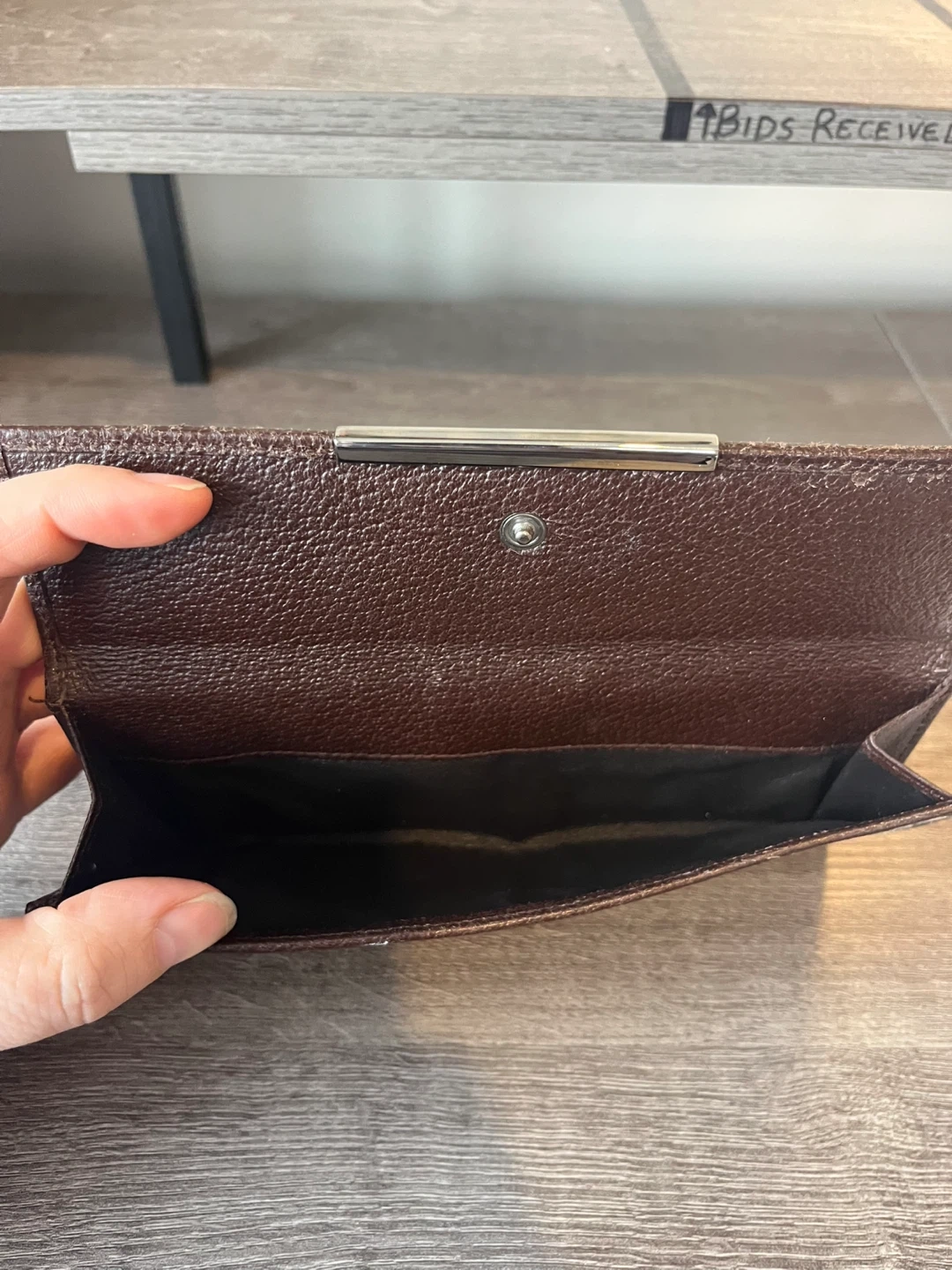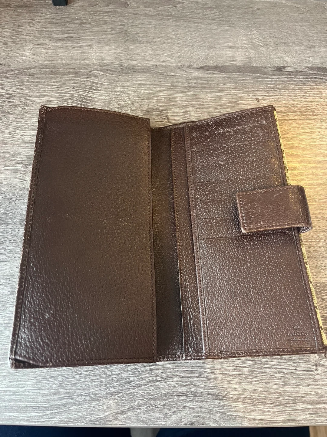 A classic Gucci wallet featuring the iconic GG canvas pattern. This bi-fold wallet has multiple card slots and compartments inside. It's made with durable canvas and leather trim.