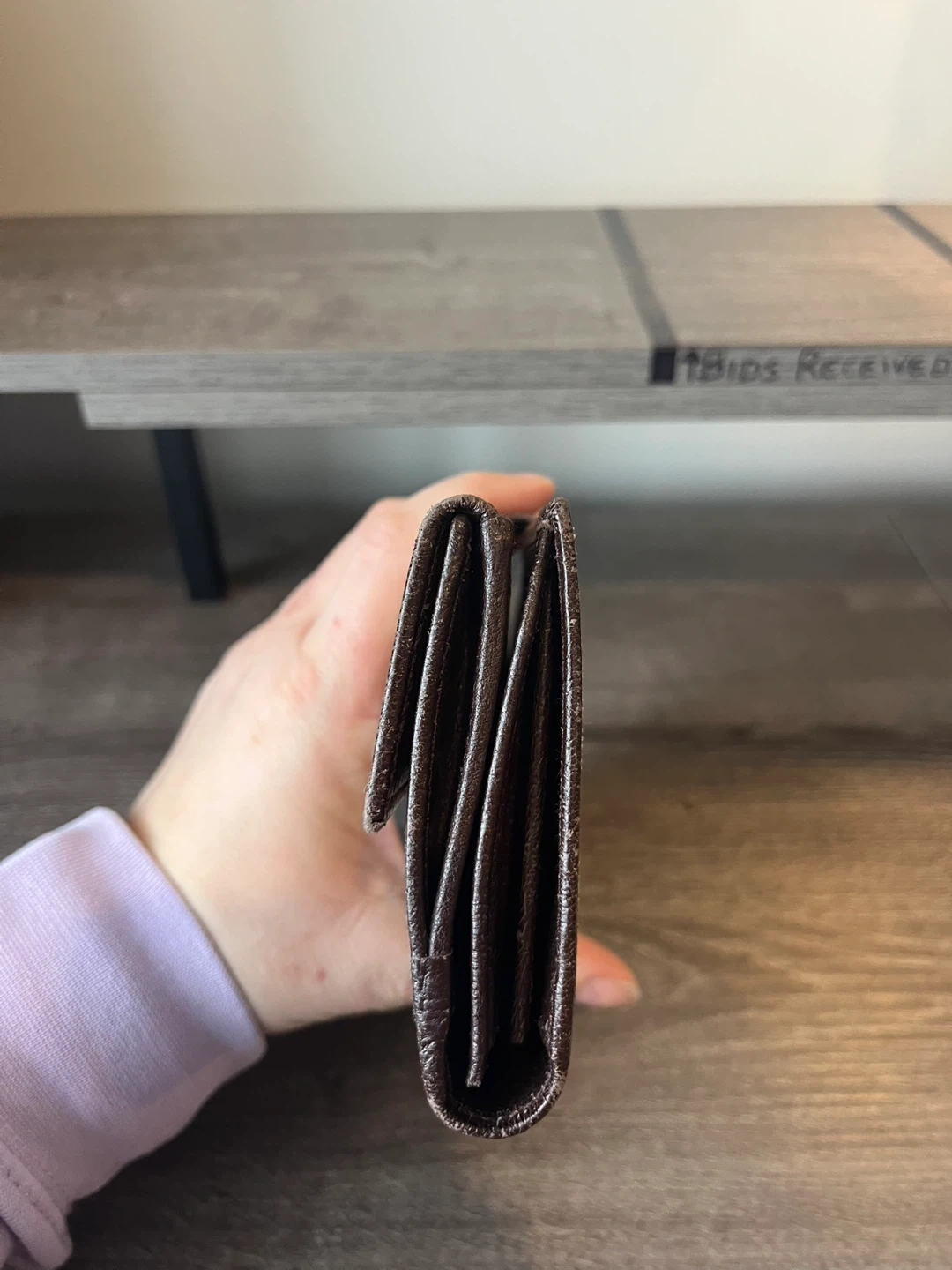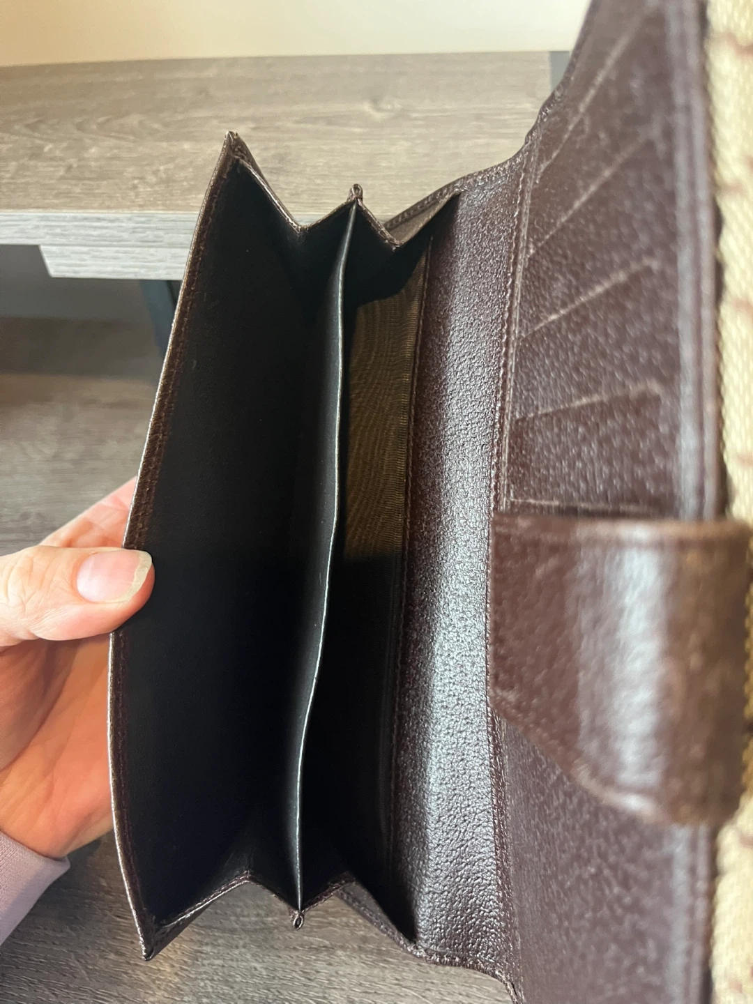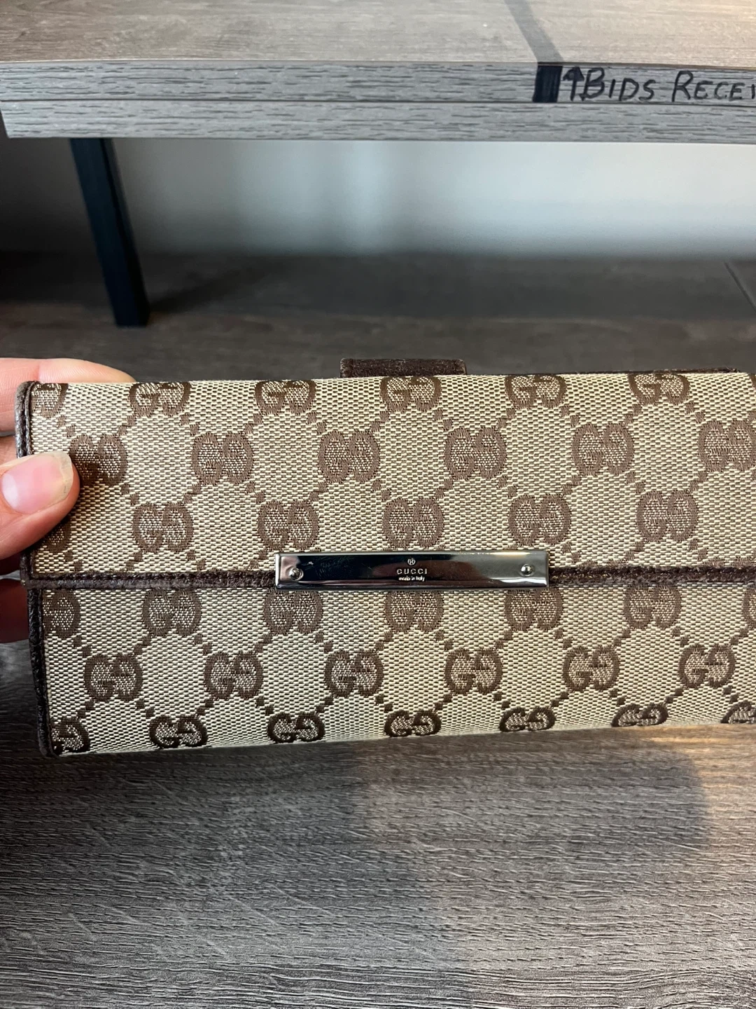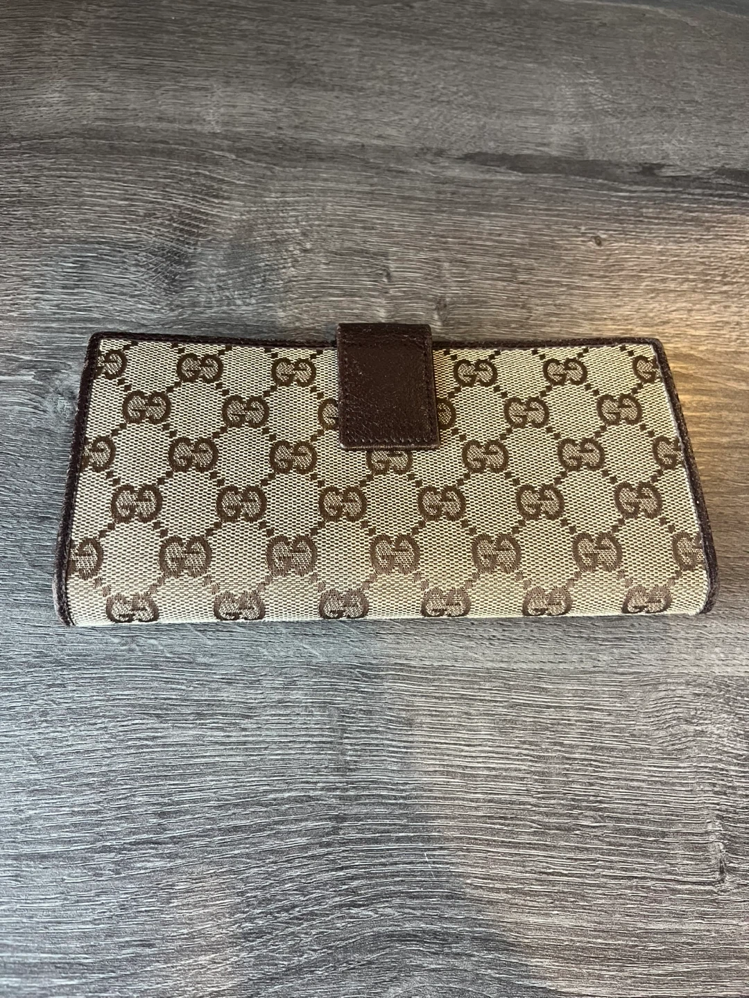 A classic Gucci wallet featuring the iconic GG canvas pattern. This bi-fold wallet has multiple card slots and compartments inside. It's made with durable canvas and leather trim.