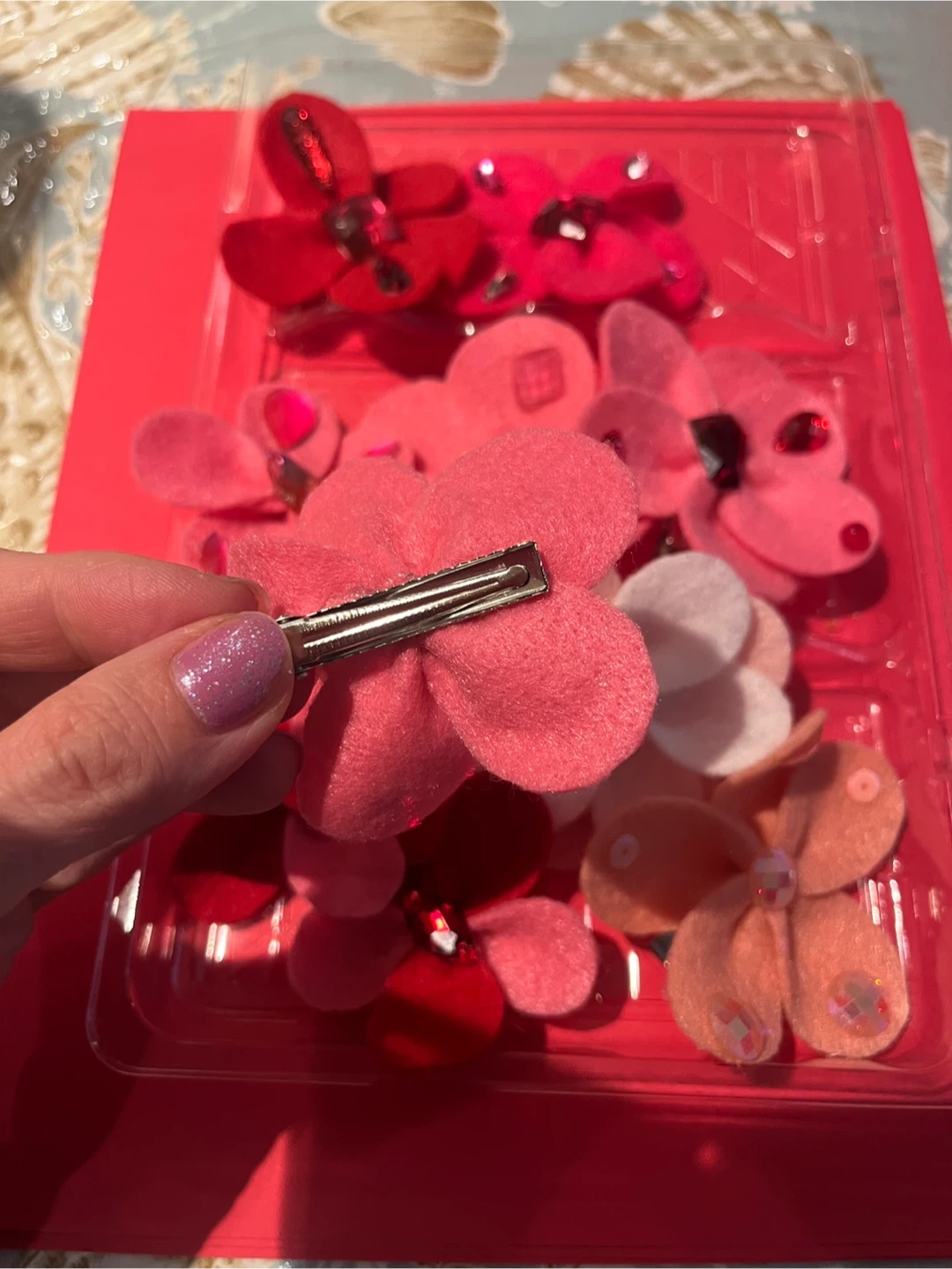 Beautiful handmade flower hair clips. Each unique, Various shades of pink and red with gem accents. Each clip features a metal barrette backing. Perfect for adding a pop of color to hairstyles or on clothing! Each is $18…they are handmade and beautiful.
