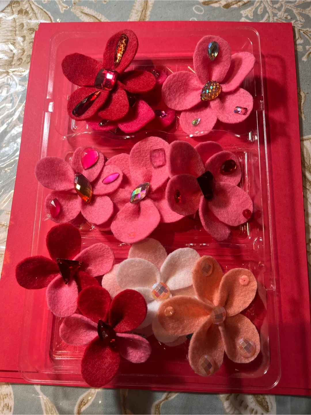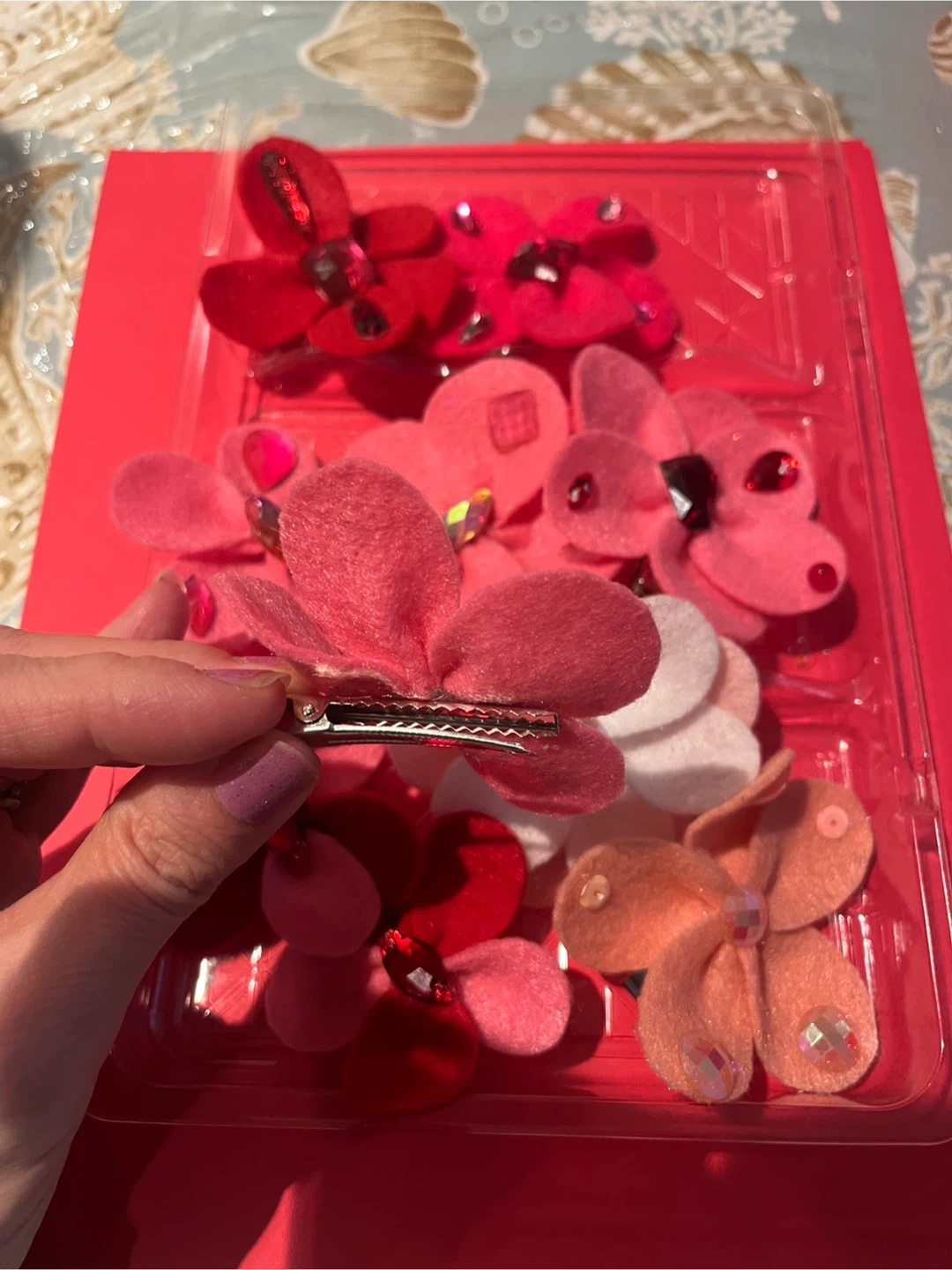 Beautiful handmade flower hair clips. Each unique, Various shades of pink and red with gem accents. Each clip features a metal barrette backing. Perfect for adding a pop of color to hairstyles or on clothing! Each is $18…they are handmade and beautiful.