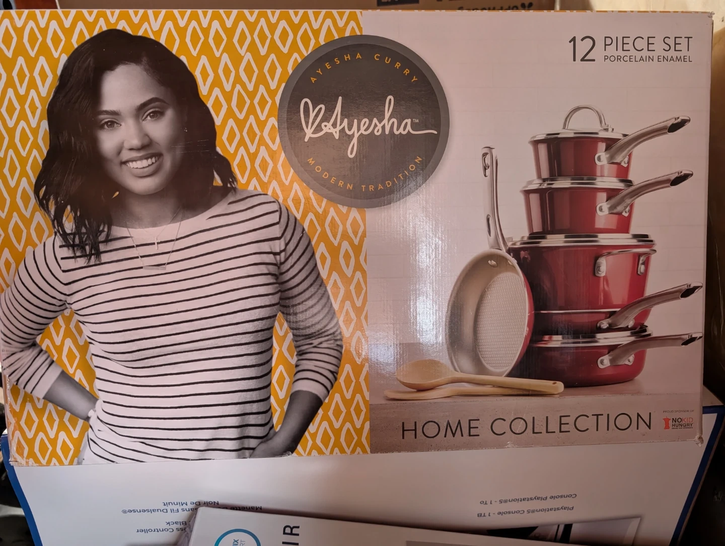 This is a 12-piece cookware set from Ayesha Curry's Home Collection. It's made of porcelain enamel. The set includes pots and pans in a deep red colour. This set would be useful for anyone looking to upgrade their kitchen essentials.