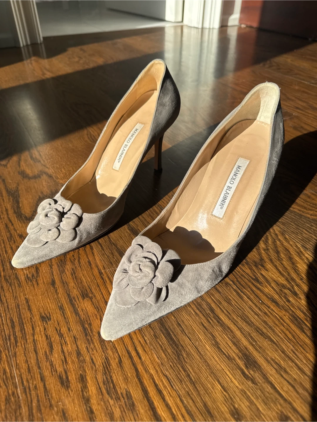 Elegant Manolo Blahnik grey suede heels featuring a delicate flower embellishment. The uppers are suede, and they have a pointed toe with a stiletto heel. Perfect for dressing up an outfit! No longer a heels lady but man these were fun the couple of times they were worn. Size 41