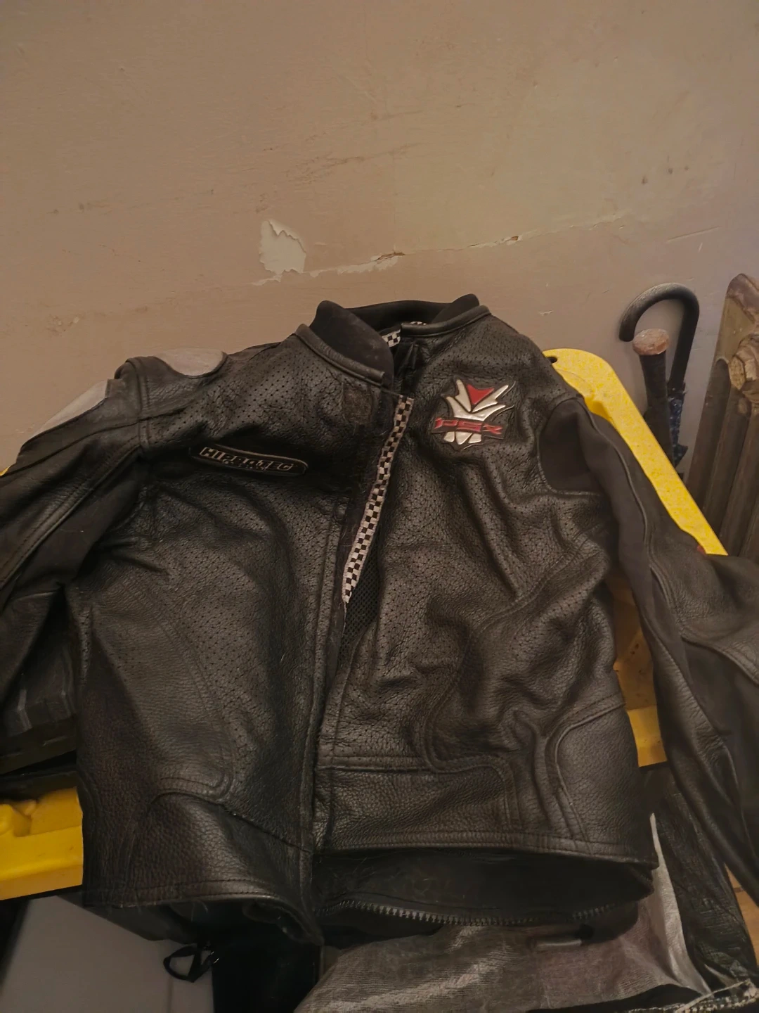 Black leather motorcycle jacket with racing design. Perforated panels for ventilation. Features full zip closure.