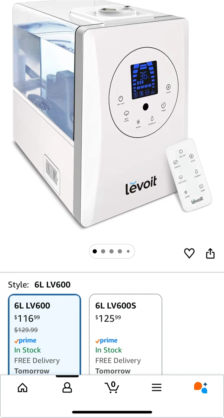 This Levoit 6L LV600 ultrasonic humidifier provides warm and cool mist options. It includes a remote control for easy operation. Tank capacity is 6 litres.