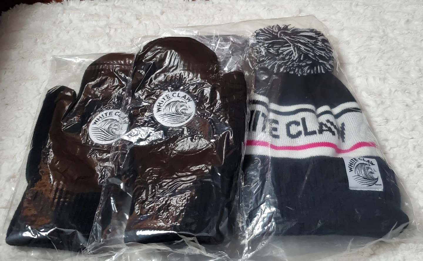 Keep warm with this White Claw branded winter set! It includes a knit hat with a pom-pom, a matching scarf, and a pair of mittens. All items are new and come in original packaging. 20$