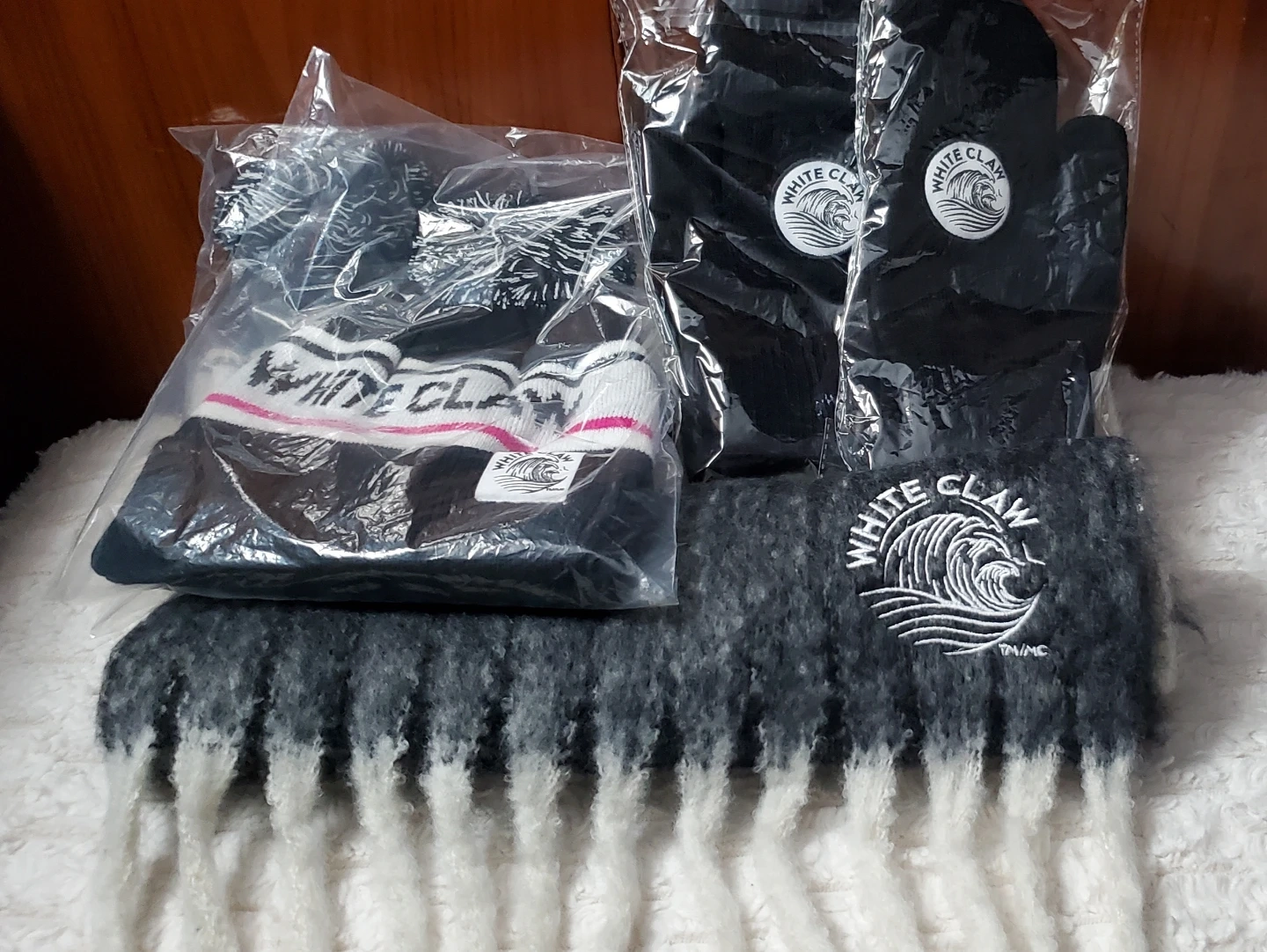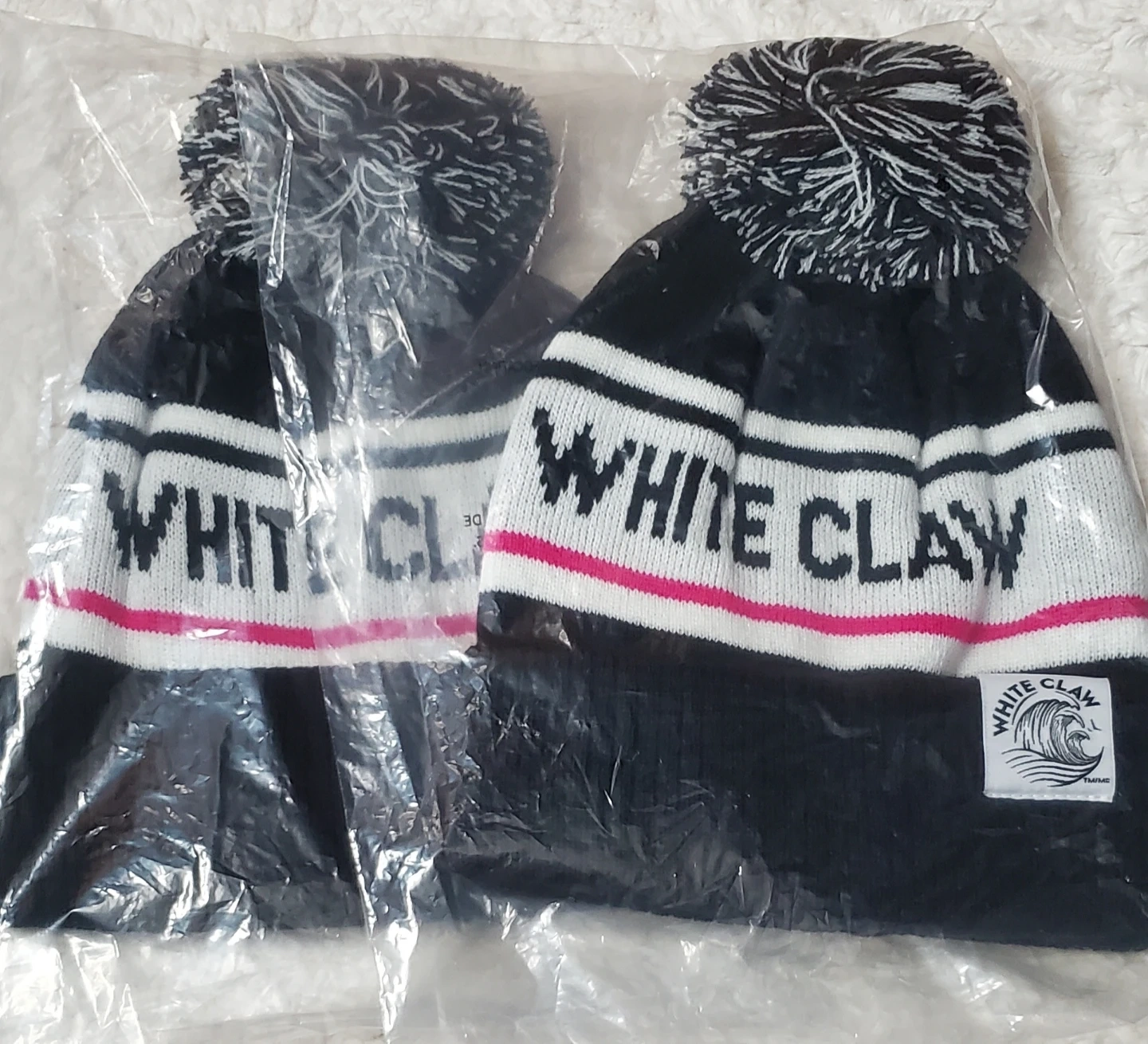 Keep warm with this White Claw branded winter set! It includes a knit hat with a pom-pom, a matching scarf, and a pair of mittens. All items are new and come in original packaging. 20$