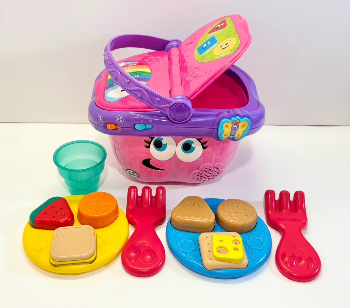 LeapFrog Shapes & Sharing Picnic Basket with interactive food and shape sorting. Includes plates, forks, cups, and food pieces like watermelon, sandwich, cookies, and cheese. Teaches colours, shapes, and sharing.