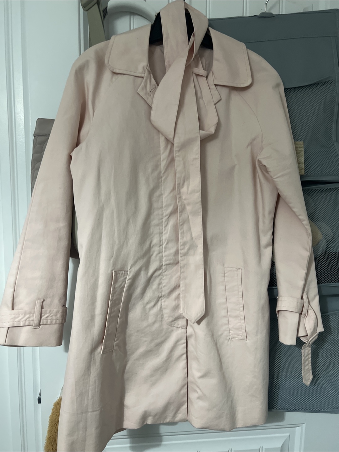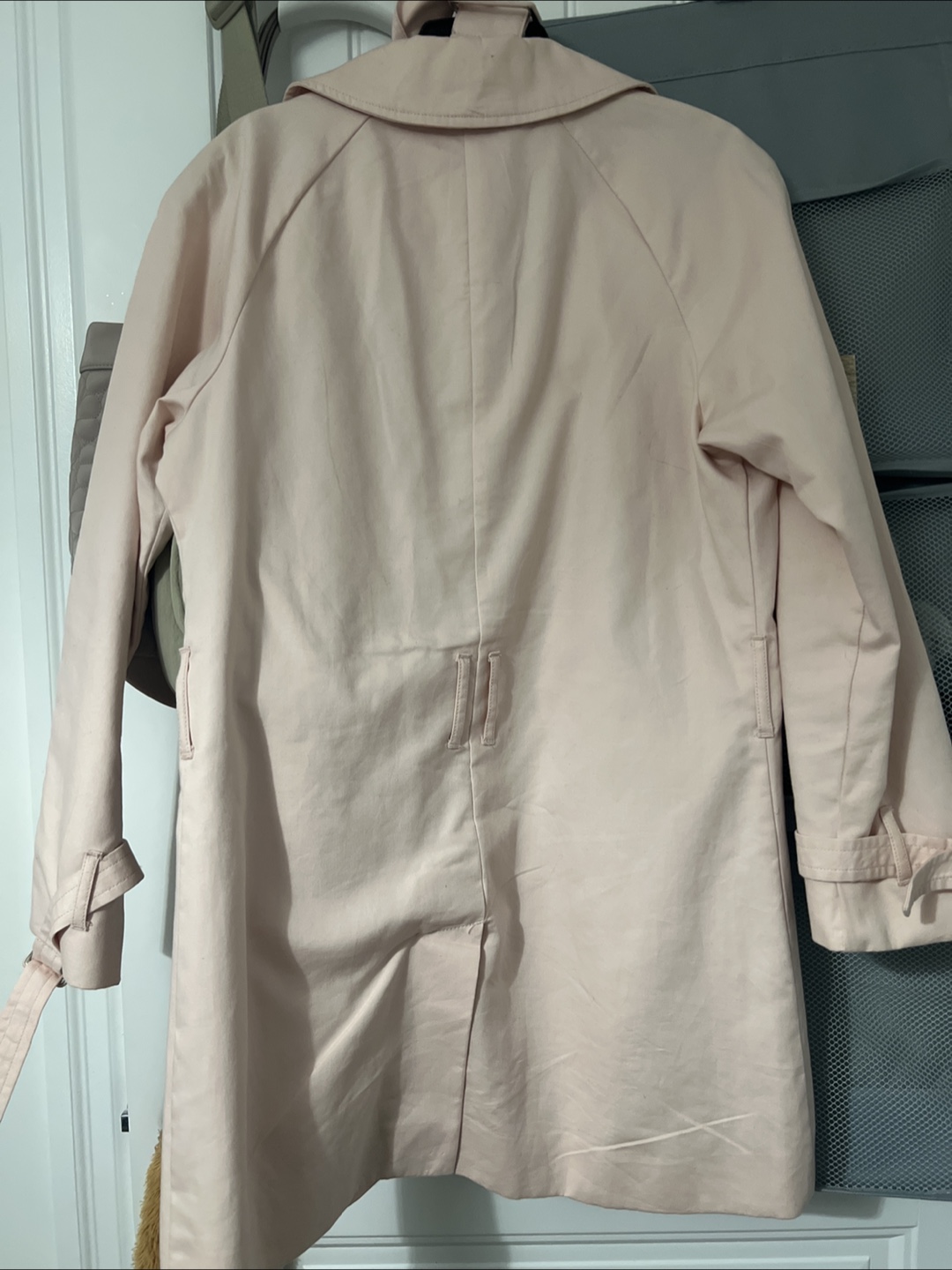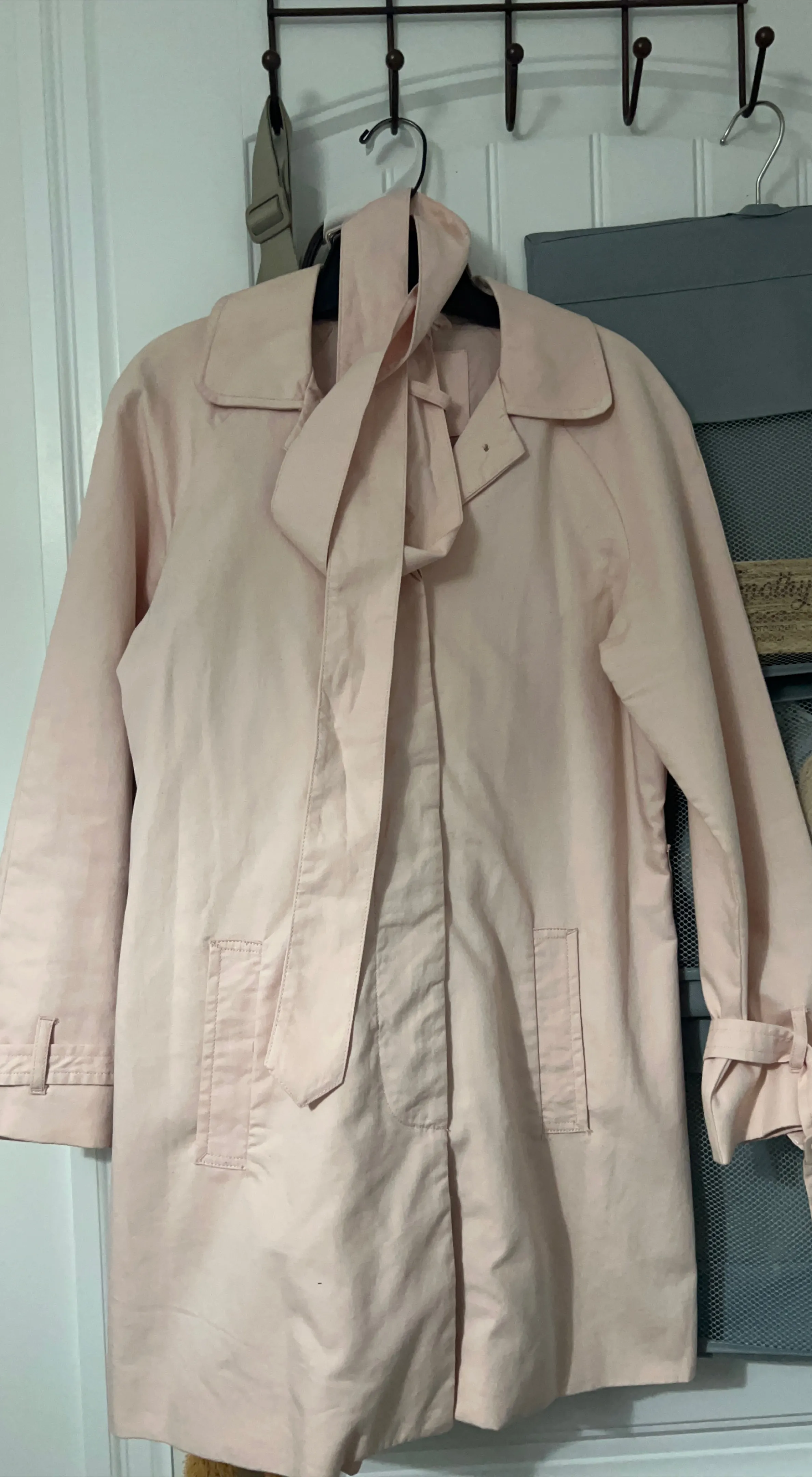 A lovely pink trench coat, perfect for spring or fall! It’s a classic trench coat styling. It's in great condition and ready for a new home