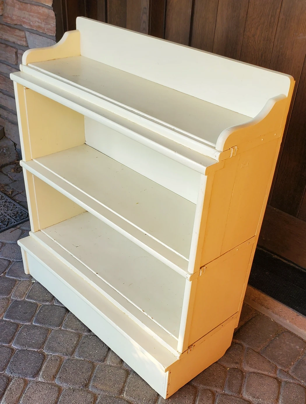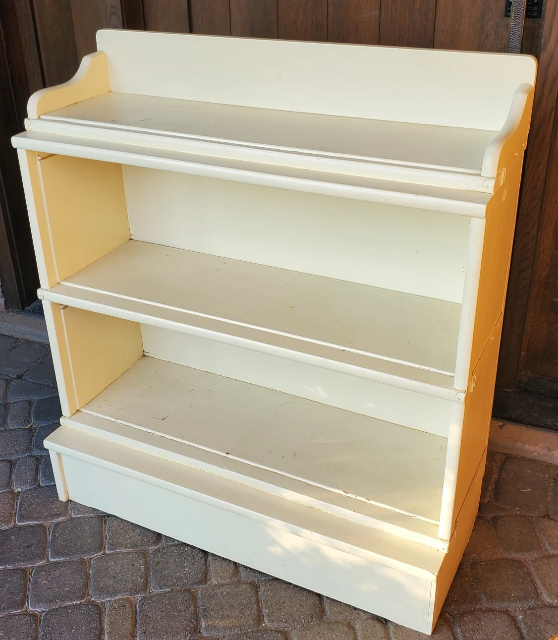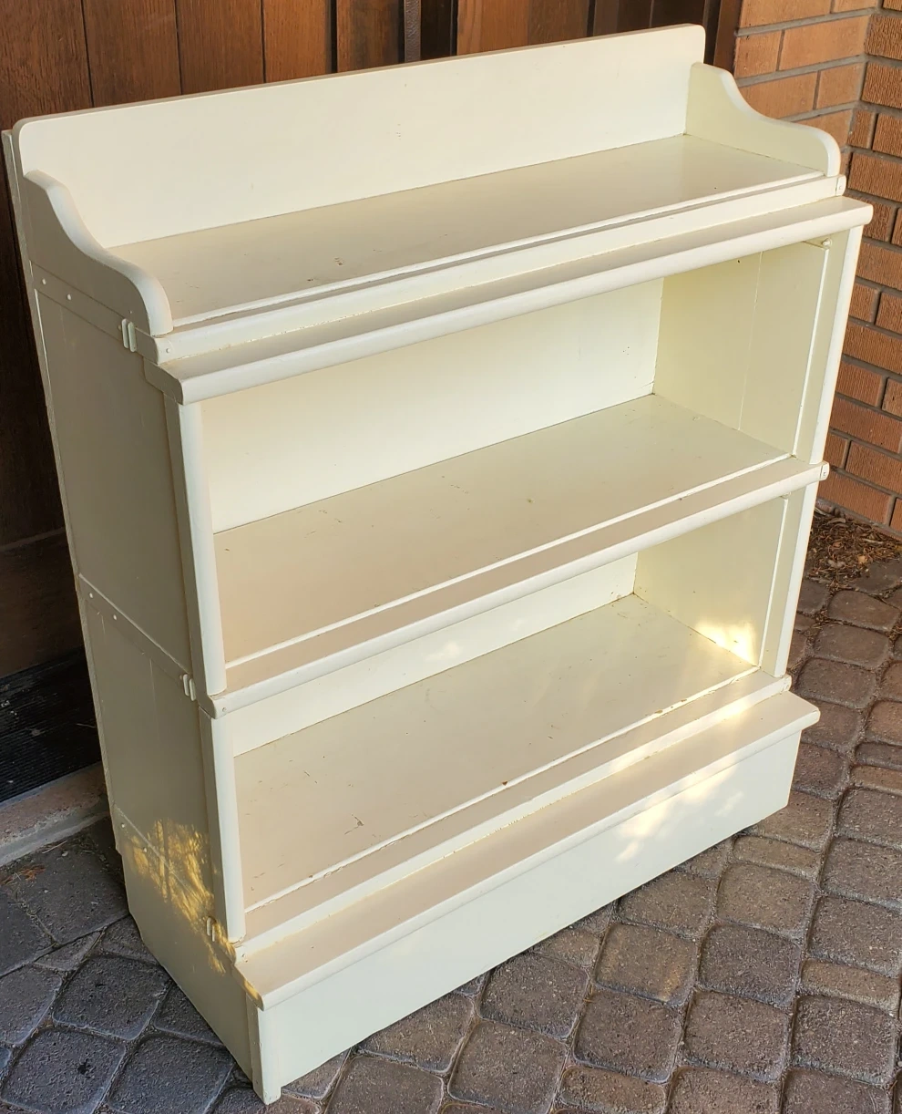 Dimensions: 86 cm wide x 96 cm tall x 29.5 cm deep. Top shelf is 12 cm high. Second shelf is 30 cm high behind decorative lip. Third shelf is 28.5 cm high behind decorative lip. Available for pickup neat Gladys Speers Public School