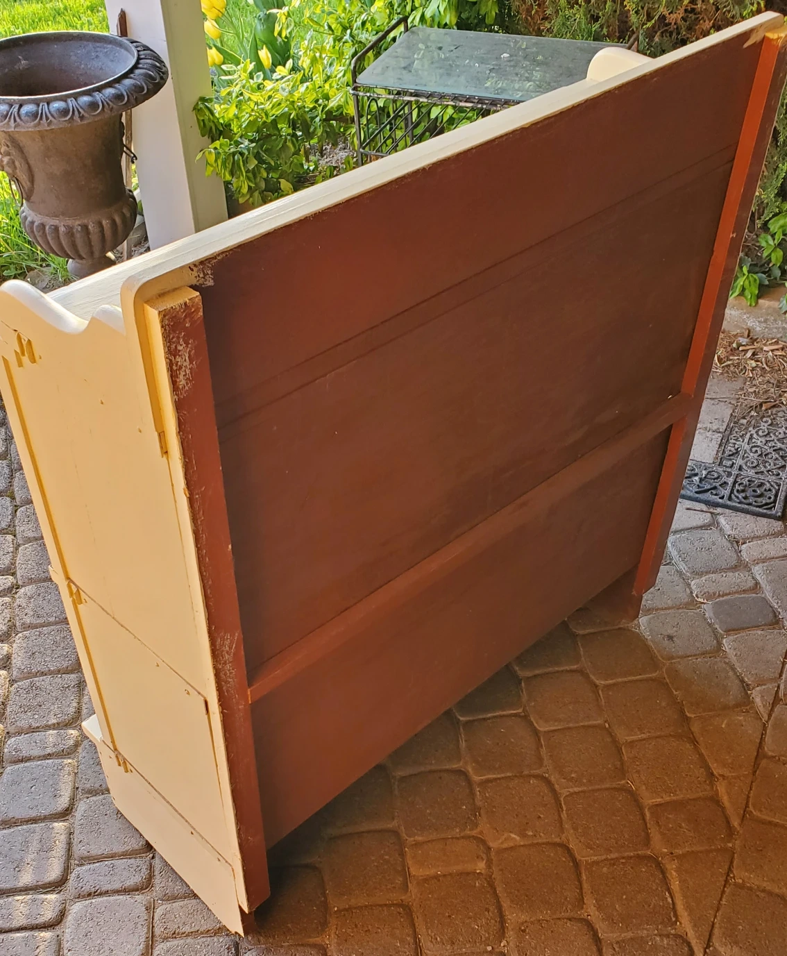 Antique solid wood sideboard or shelving unit, could be used as a bookshelf. Top sideboard shelf has scrollwork-style decorative edges. Two additional shelves with front decorative lip. Base has dental shelf for added stability and strength. Unit is hand made of hard wood, possibly cherry. Recently painted, underside of shelves and back show original staining. Heavy and extremely well built. Each shelf reinforced with painted metal bracket and screws. No damage or warping, shelves perfectly straight. Unit sits flat on floor no wobbling. Unique piece, in beautiful condition and will last.