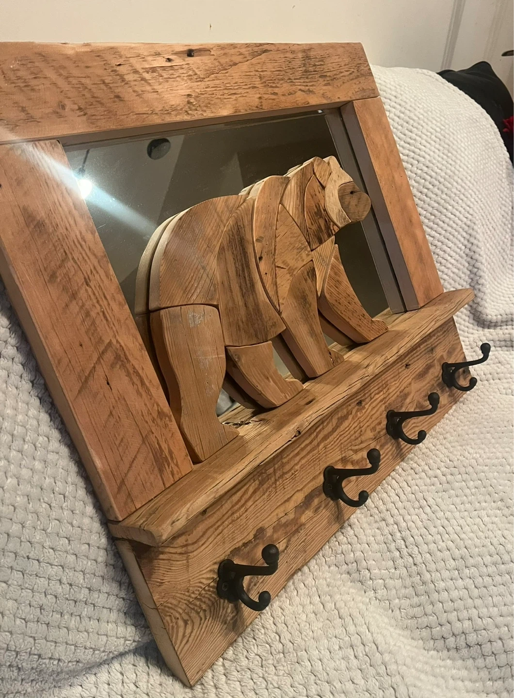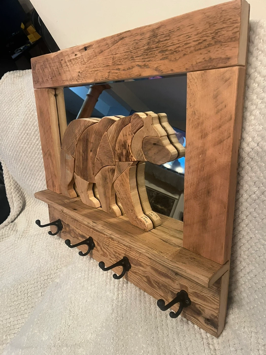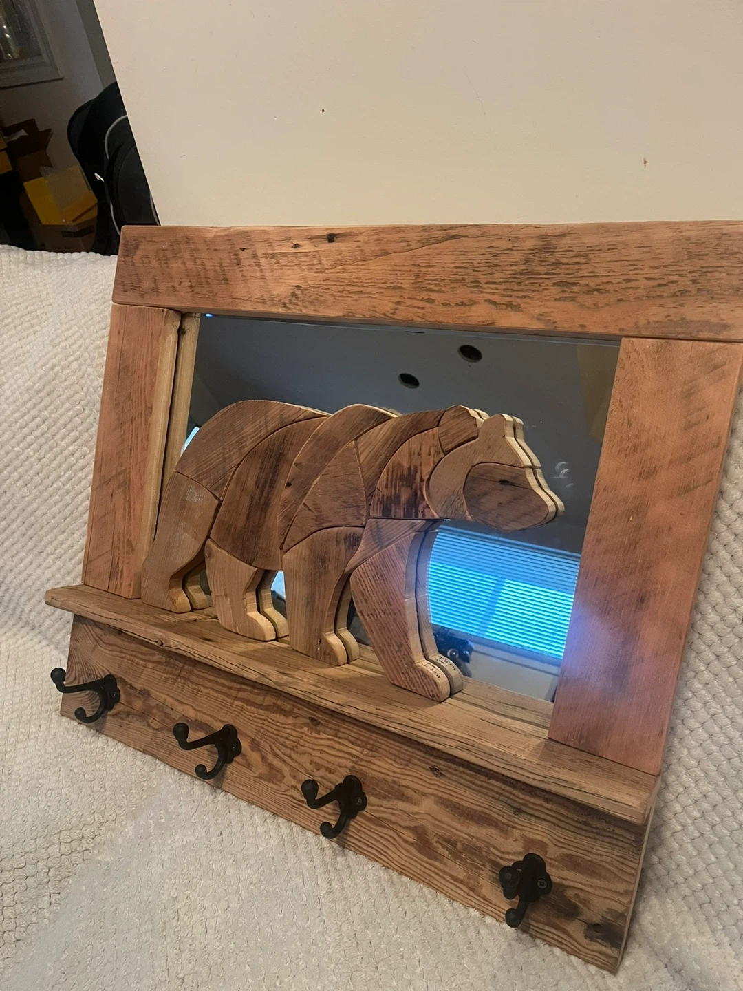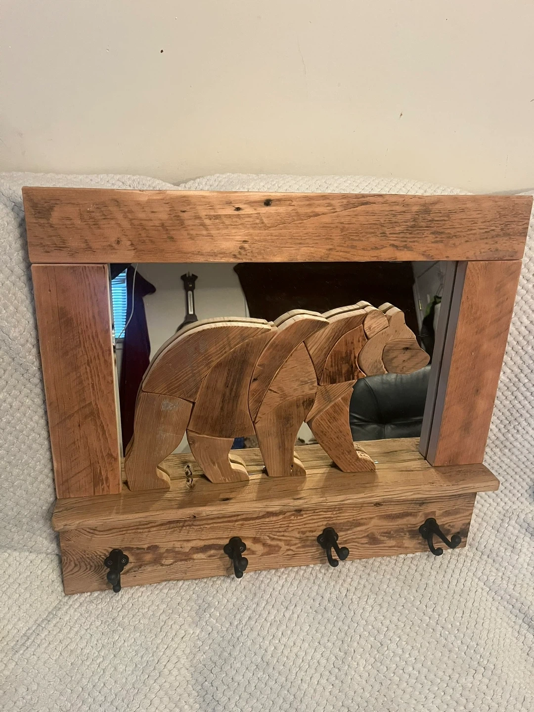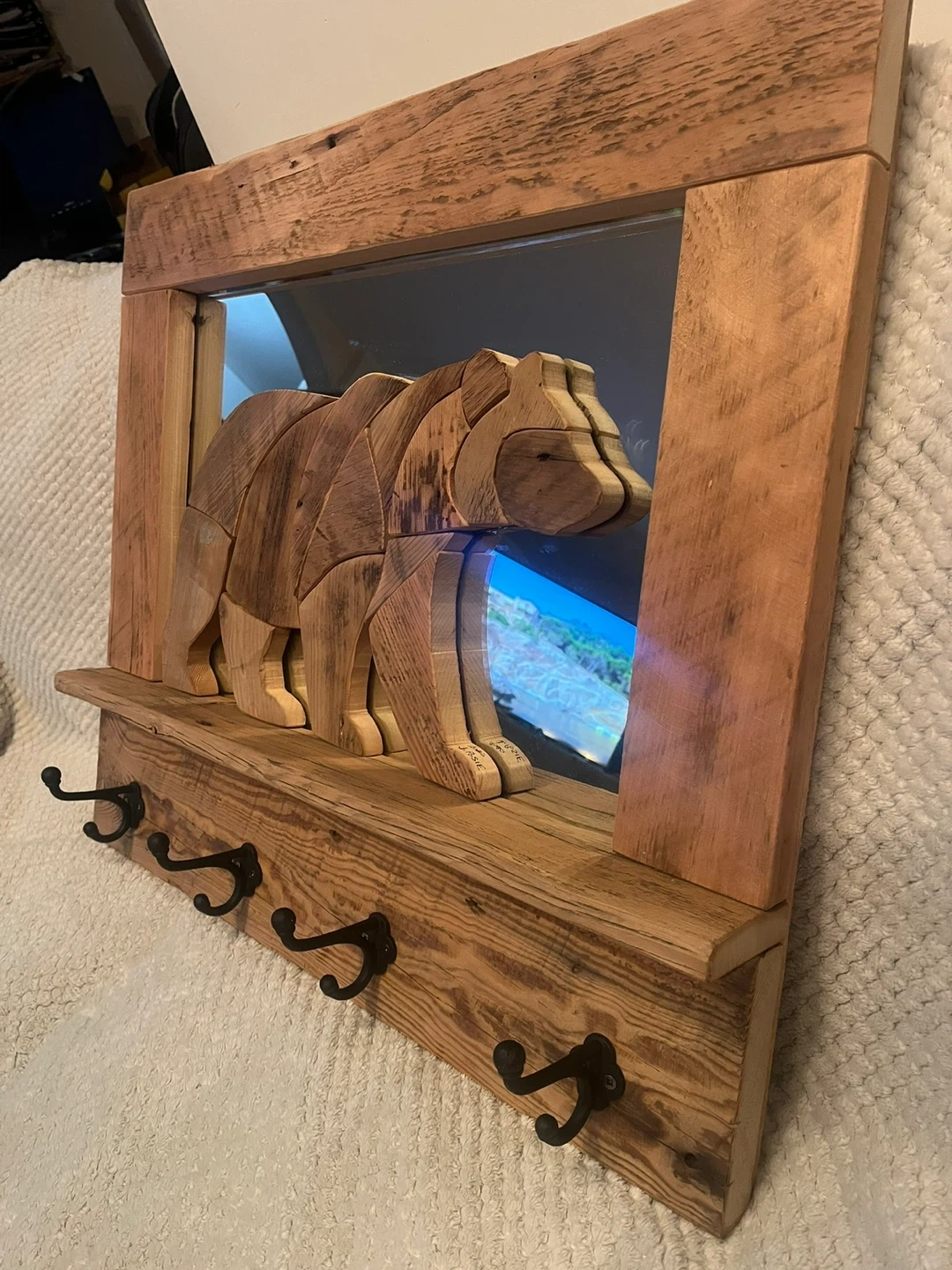 This handcrafted Barn board “Bear” Coat rack is a one of a kind piece. I handmade with locally sourced authentic Barn boards. The Bear is set on a mirrored background. It has 4 cast iron hooks . Perfect conversation piece for any entryway of your home or cottage. I custom make different things. Size is 26” x 23” . I can also deliver within reasonable distance. Message for more info.