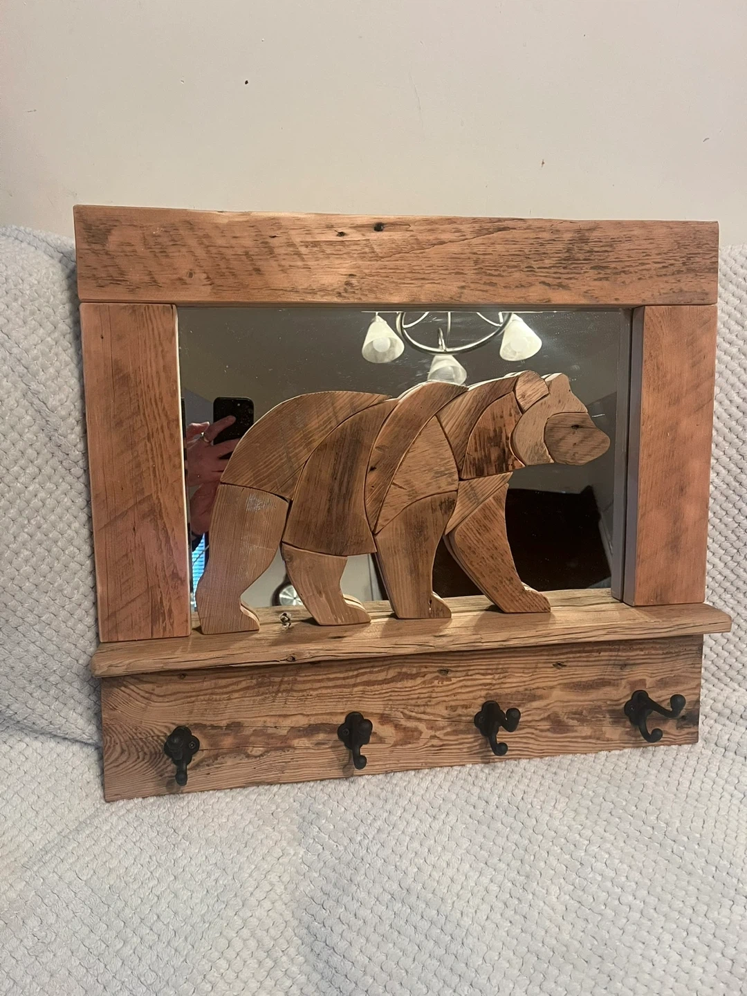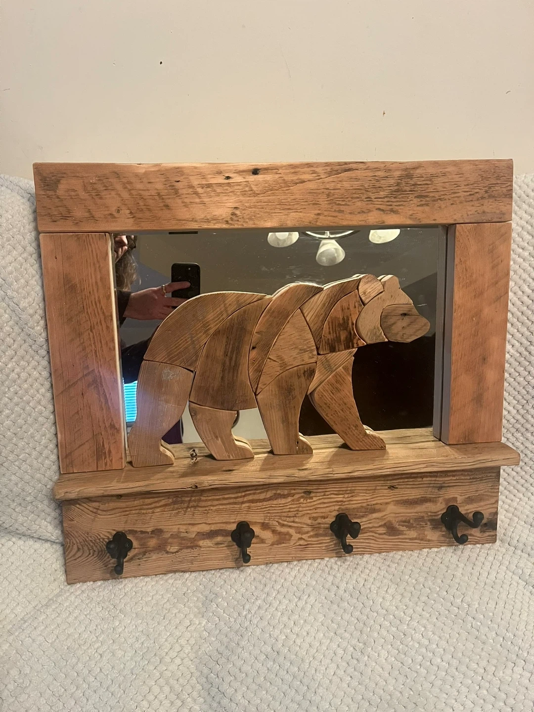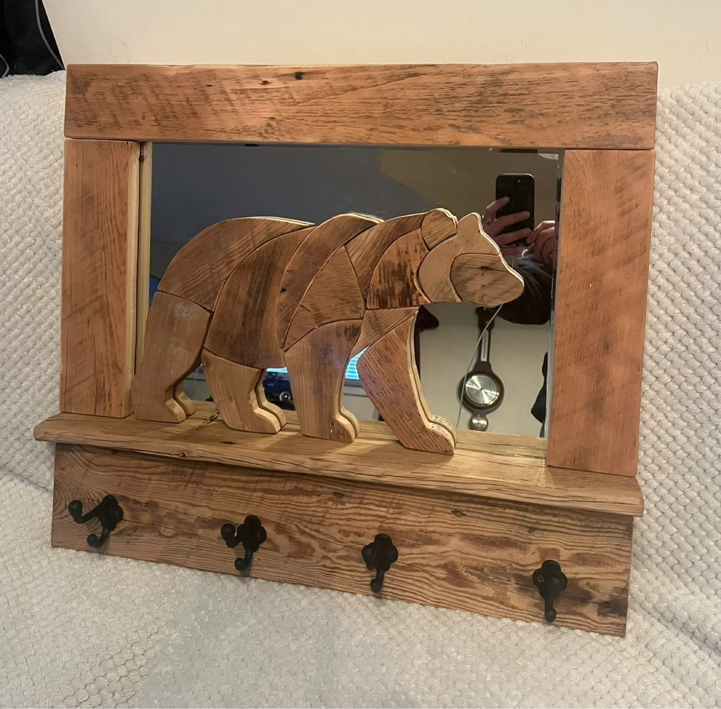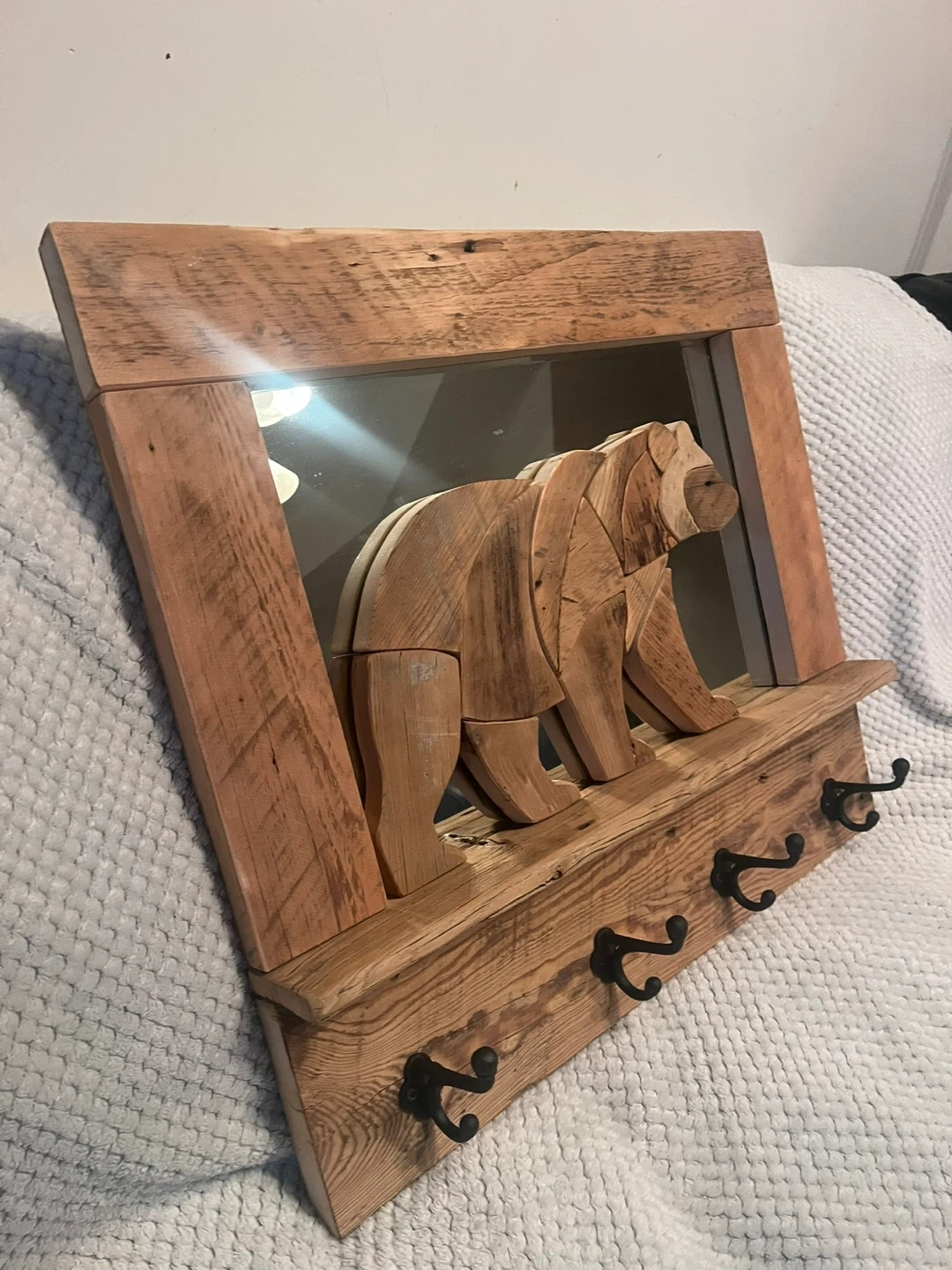 This handcrafted Barn board “Bear” Coat rack is a one of a kind piece. I handmade with locally sourced authentic Barn boards. The Bear is set on a mirrored background. It has 4 cast iron hooks . Perfect conversation piece for any entryway of your home or cottage. I custom make different things. Size is 26” x 23” . I can also deliver within reasonable distance. Message for more info.