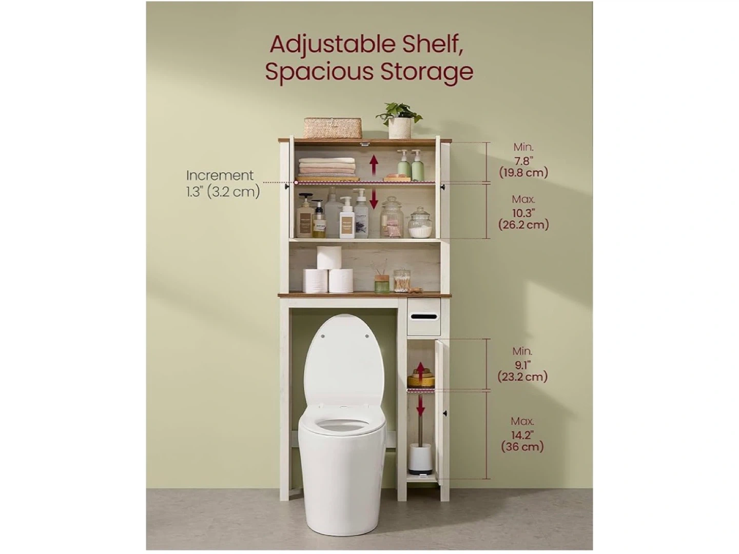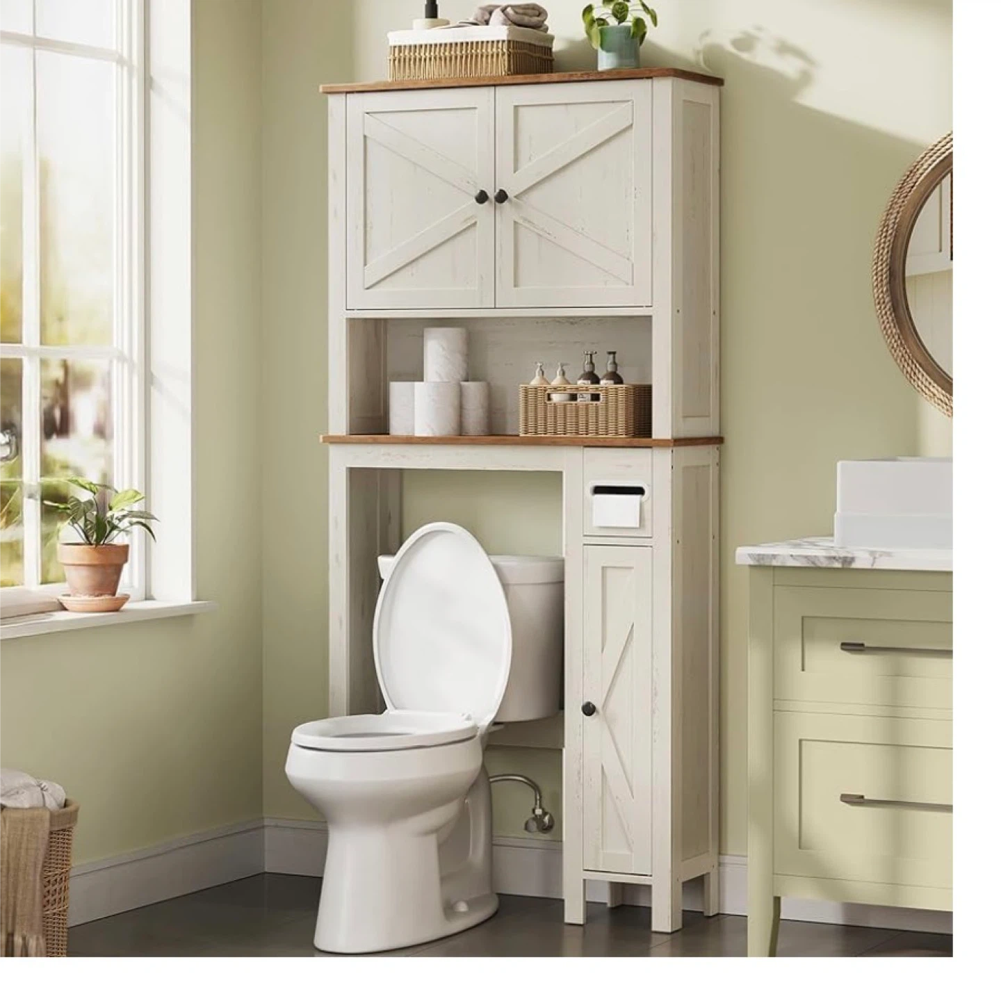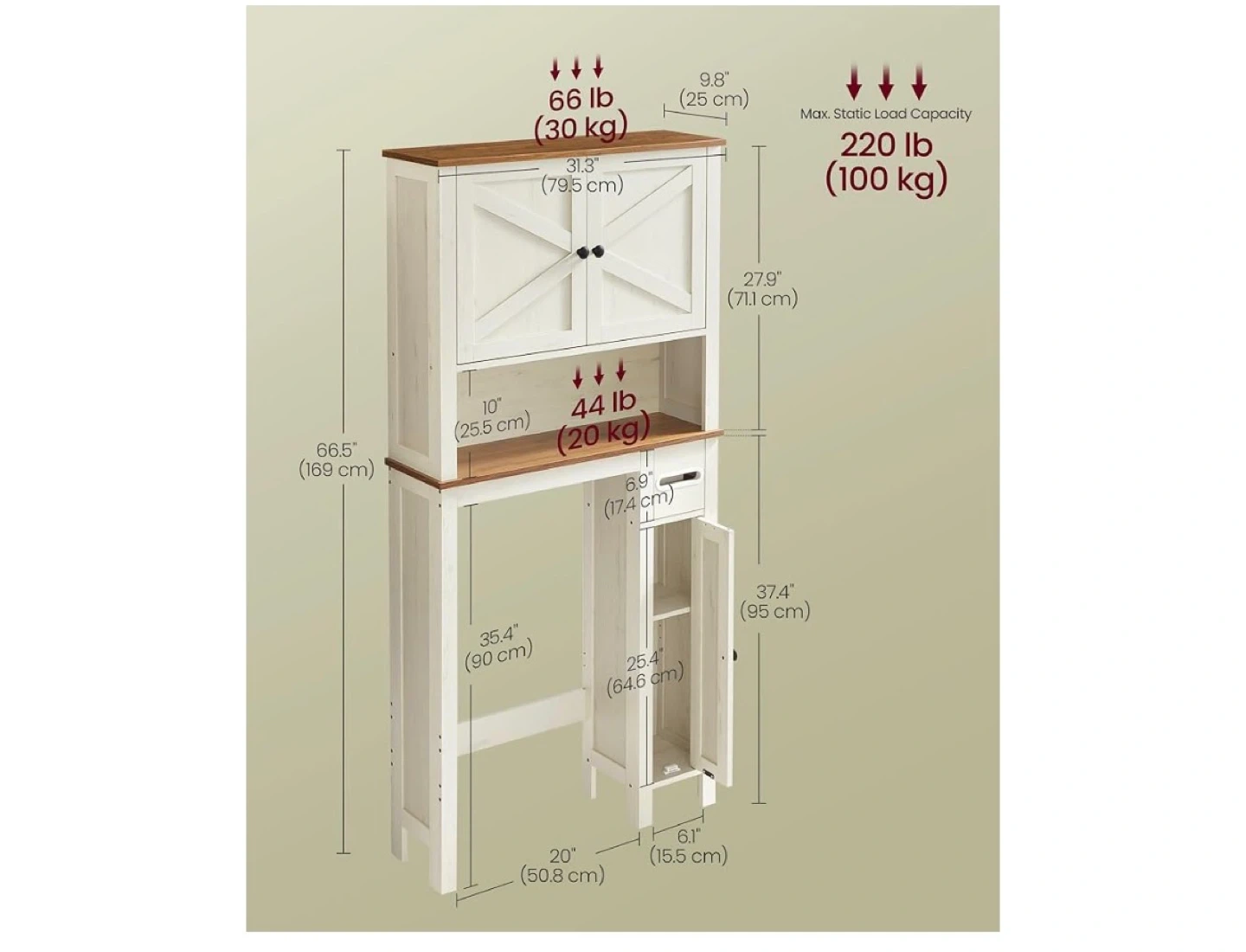 This spacious storage cabinet fits over your toilet, offering adjustable shelving and a barn door design. It's made of engineered wood with a rustic white finish and a brown wood top. The cabinet has a max static load capacity of 220 lb (100 kg).