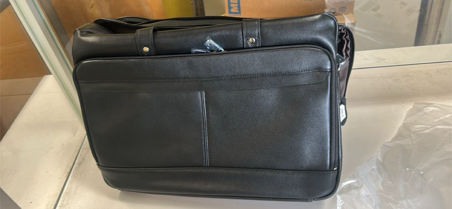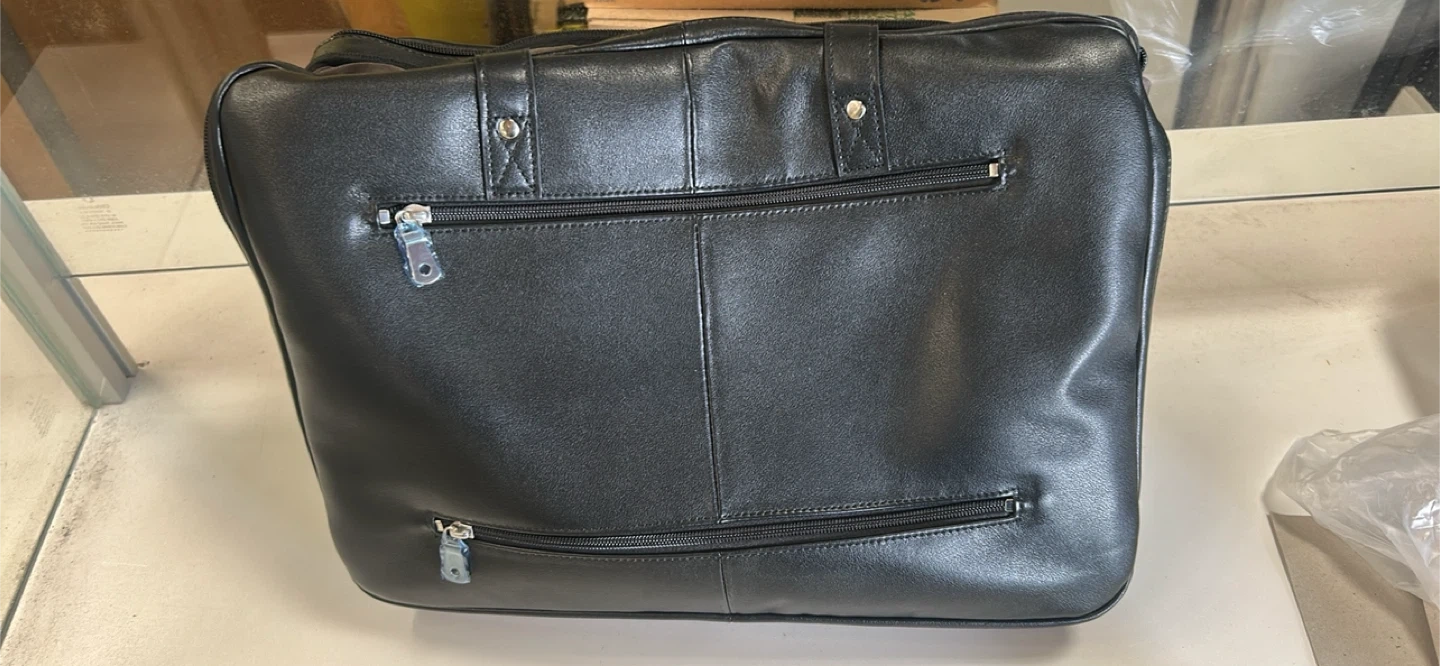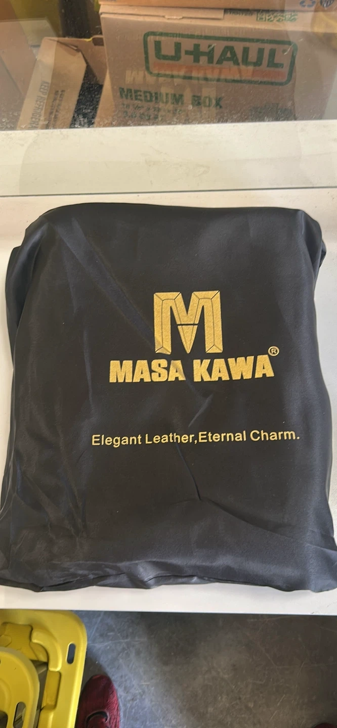This is a Masa Kawa black leather briefcase. It's a large size, perfect for carrying documents and a laptop. Includes a protective dust bag.