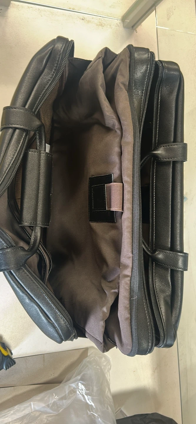 This is a Masa Kawa black leather briefcase. It's a large size, perfect for carrying documents and a laptop. Includes a protective dust bag.