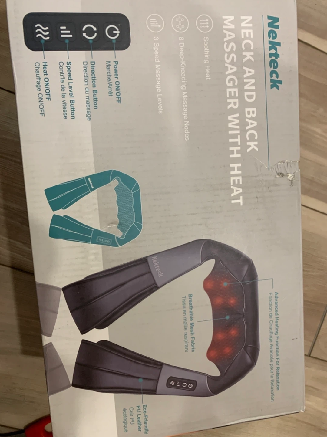 This Nekteck neck and back massager has soothing heat and 8 deep-kneading massage nodes. It features 3 speed massage levels and uses eco-friendly PU leather. The breathable mesh fabric offers advanced heating for relaxation.