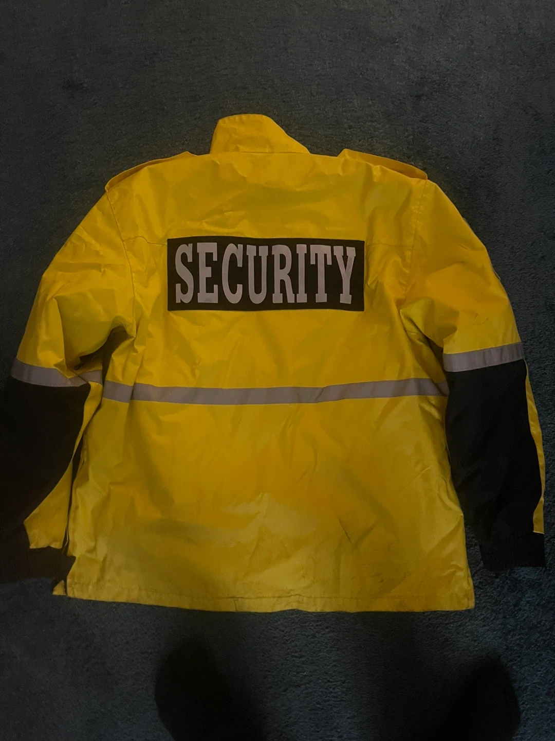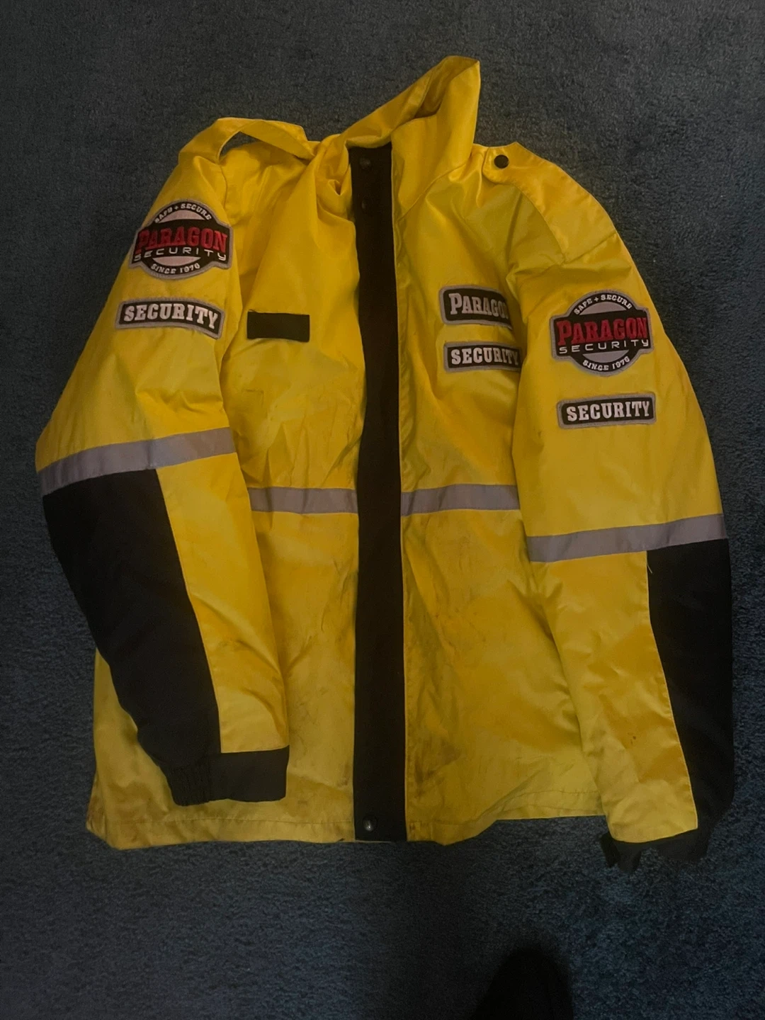 Bright yellow security jacket with reflective stripes. Features 'SECURITY' patches on the back and sleeves. Made by Paragon Security since 1976. Good for security personnel or visibility needs.