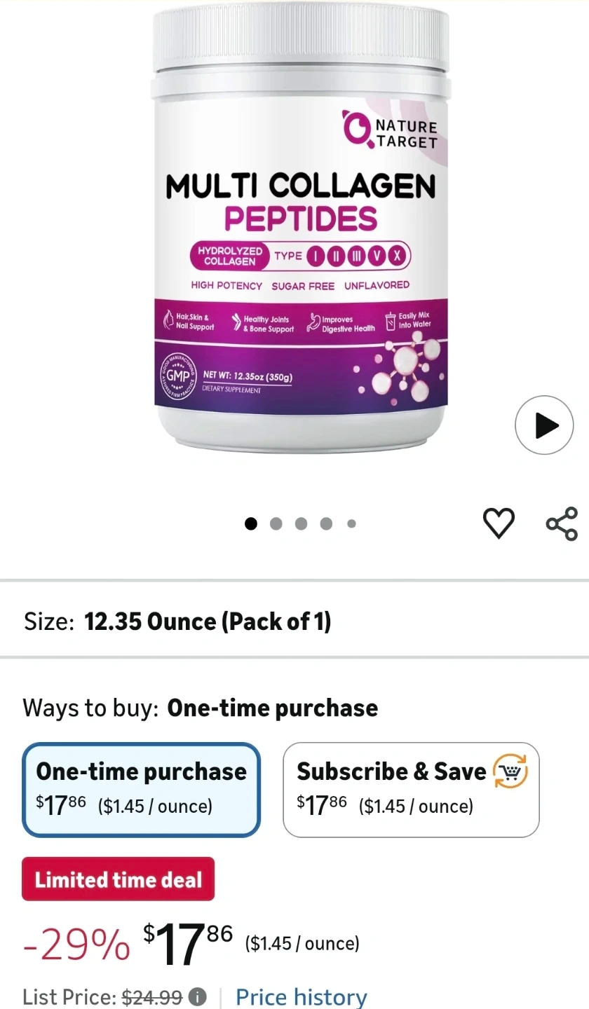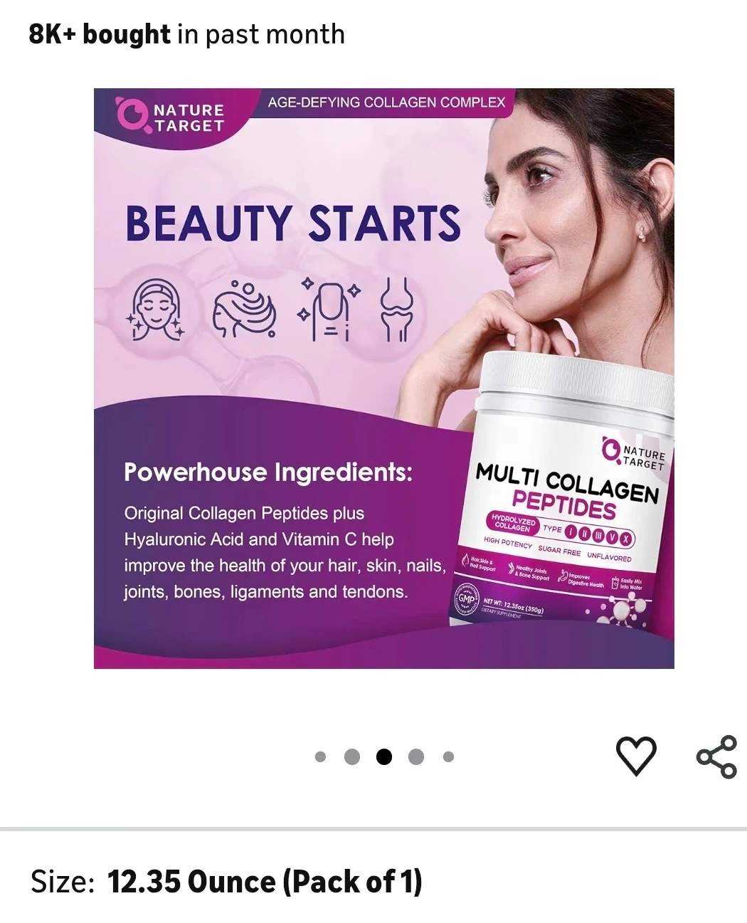 🥕This is Nature Target Multi Collagen Peptides powder. It's unflavored and sugar-free. Net weight is 12.35 oz (350g). The expiration date is 05/2028.