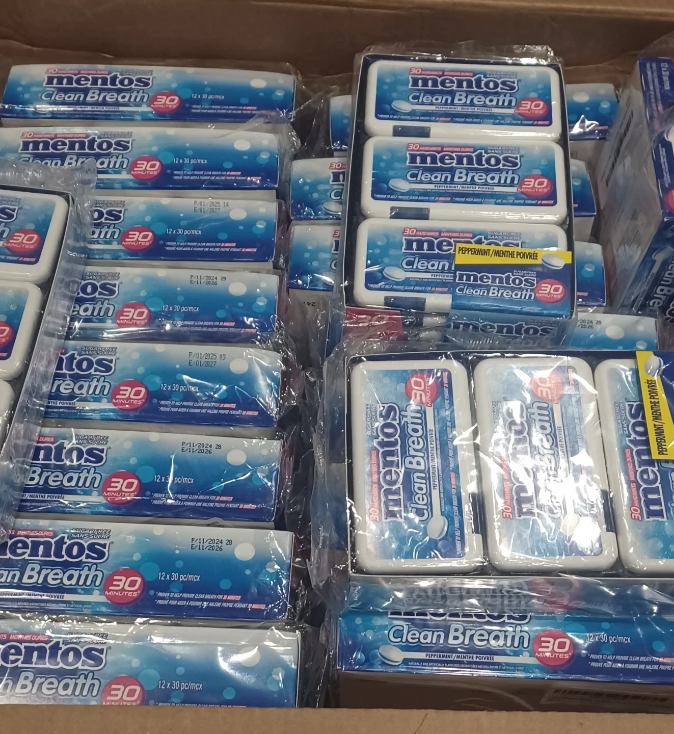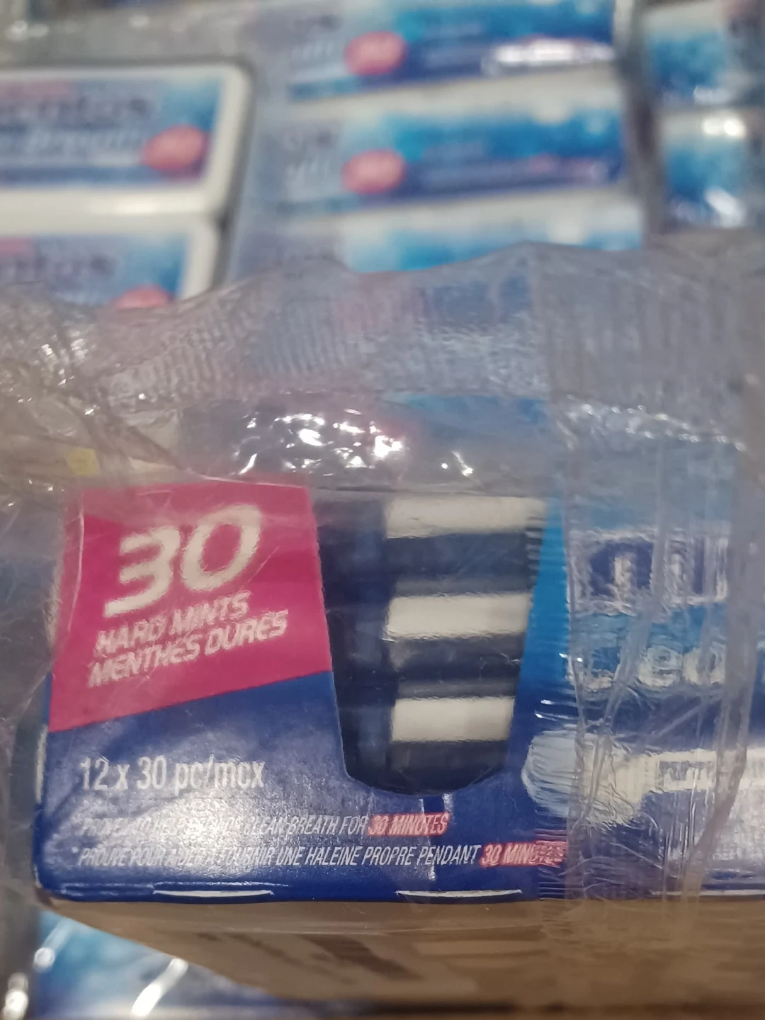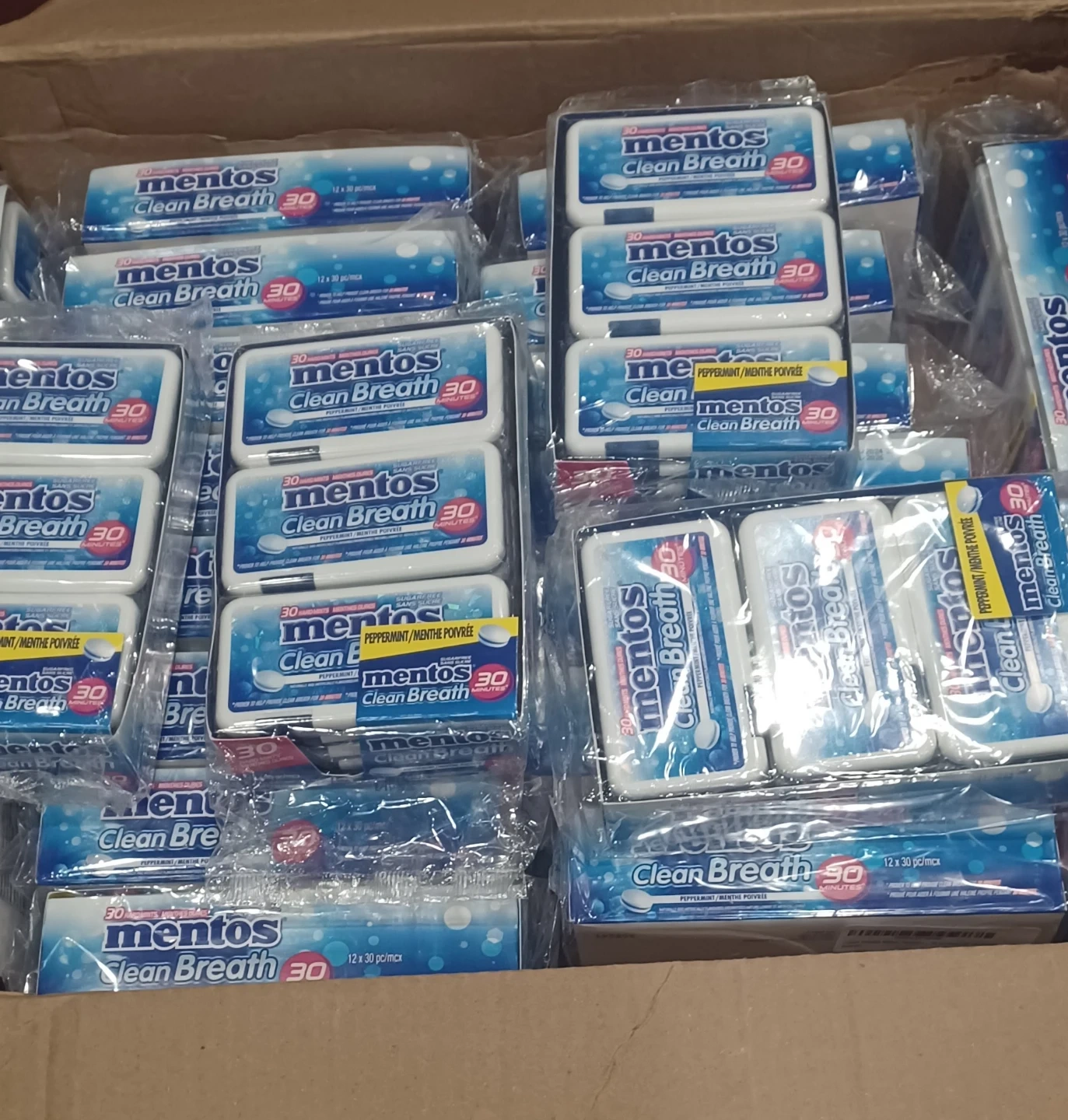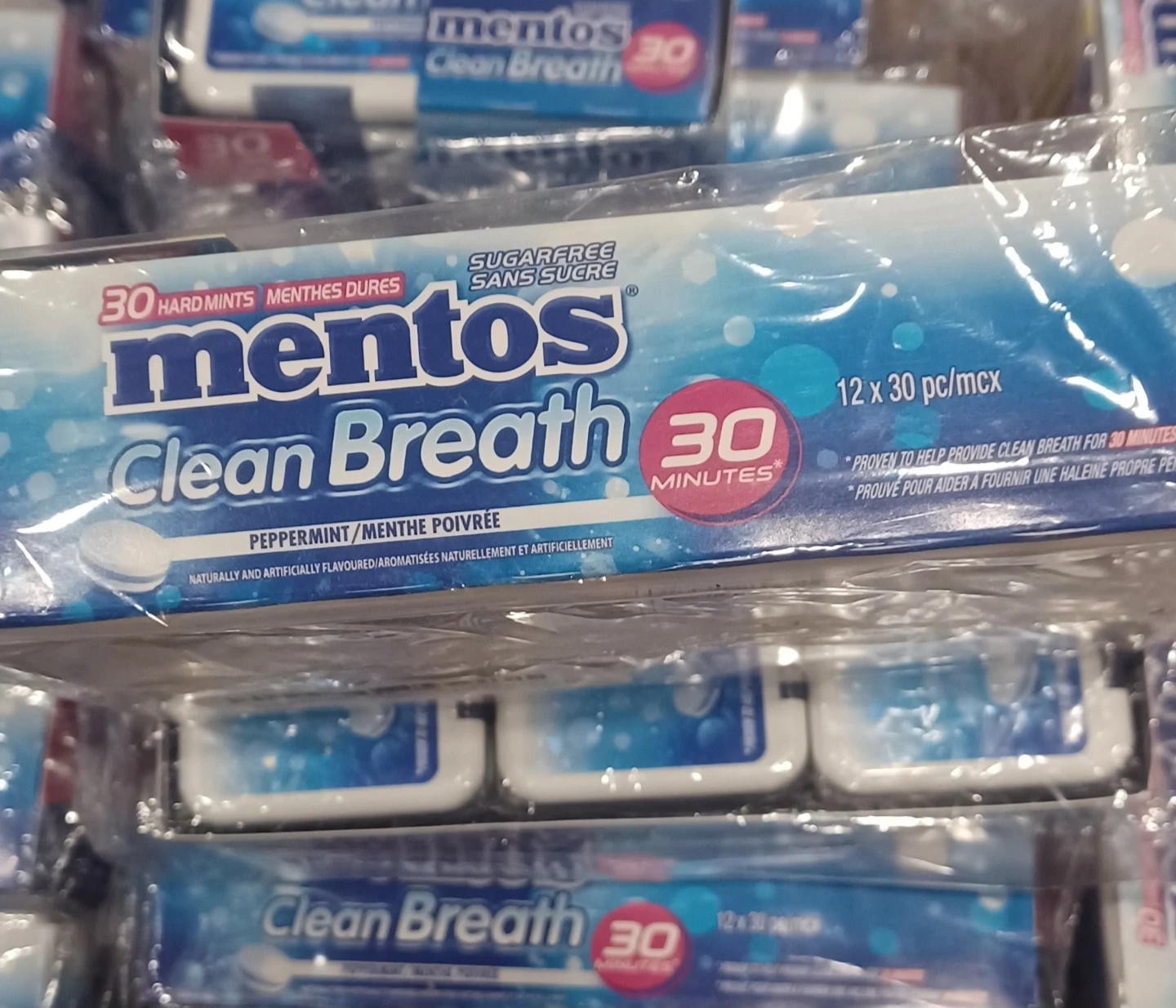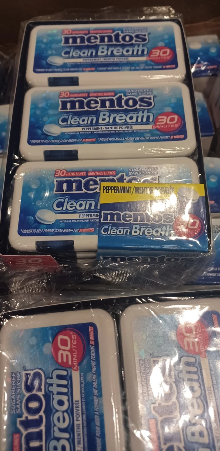 New Mentos Clean Breath peppermint hard mints! Each pack has 30 sugar-free mints. This is a 12-pack, so you get a bunch. Great for fresh breath on the go, lasts for 30 minutes.