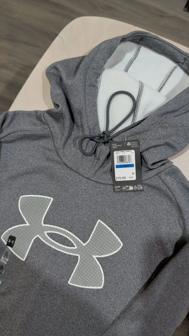 This is a new Under Armour men's hoodie in grey. It's a size large with the signature Under Armour logo on the front. The hoodie features a comfortable fleece lining and a drawstring hood. Perfect for staying warm during cooler weather!