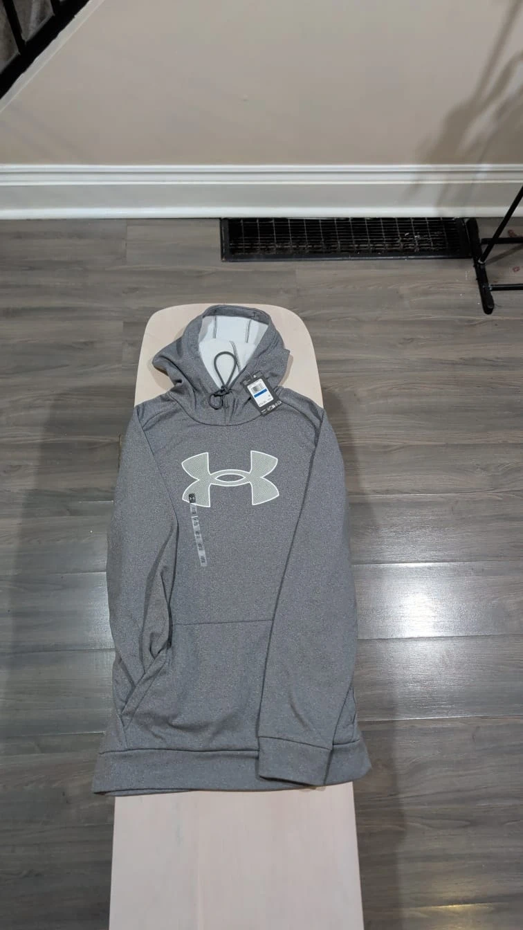 This is a new Under Armour men's hoodie in grey. It's a size large with the signature Under Armour logo on the front. The hoodie features a comfortable fleece lining and a drawstring hood. Perfect for staying warm during cooler weather!