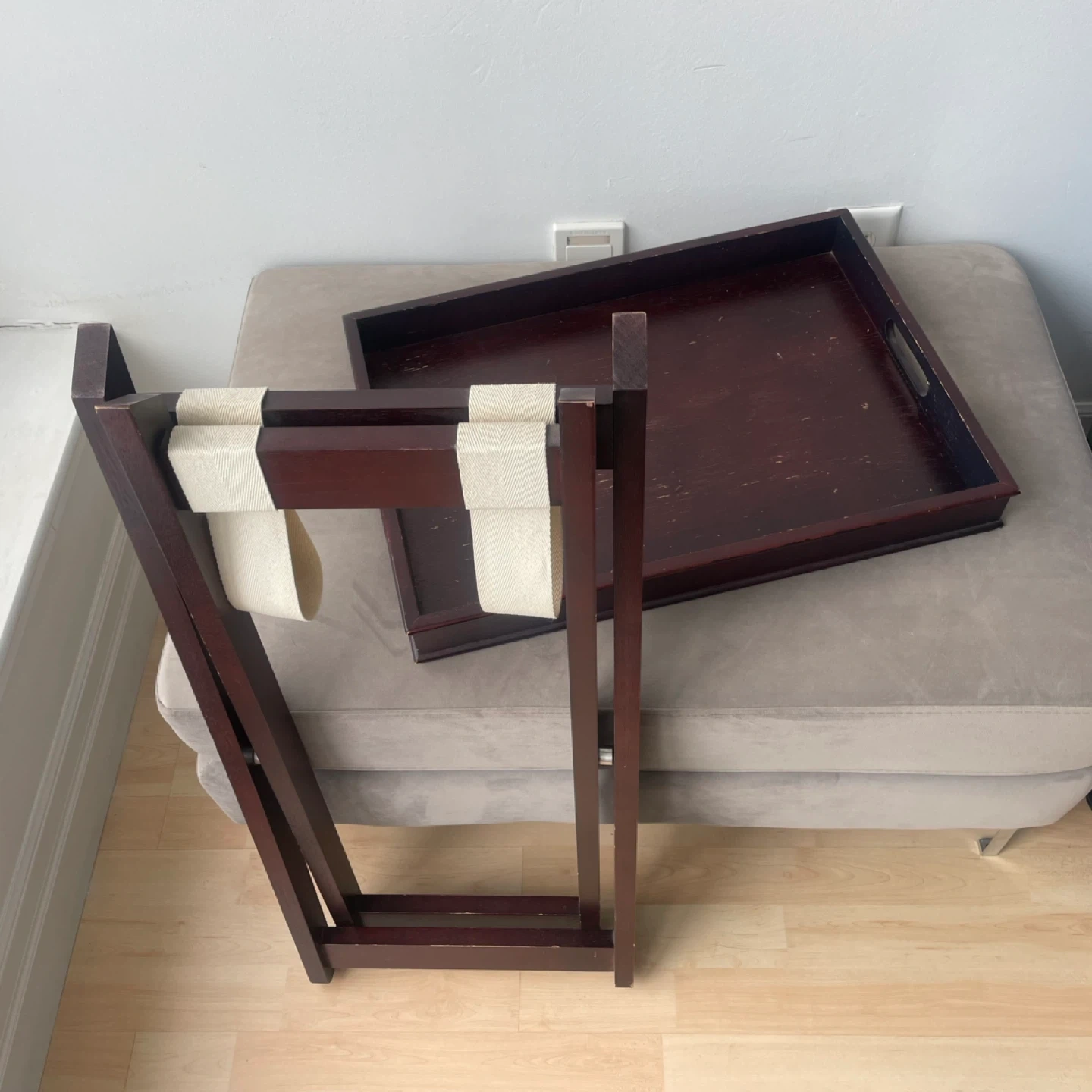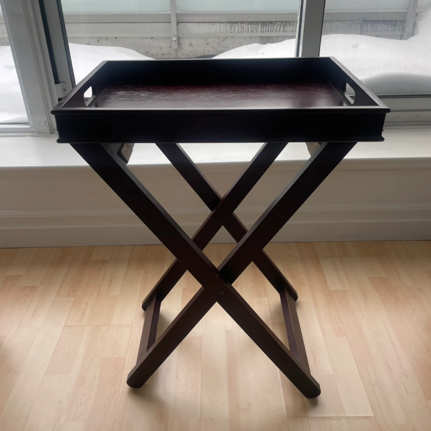 A dark wood finish folding tray table or side table. It's perfect for holding or serving drinks or snacks or decorative items.