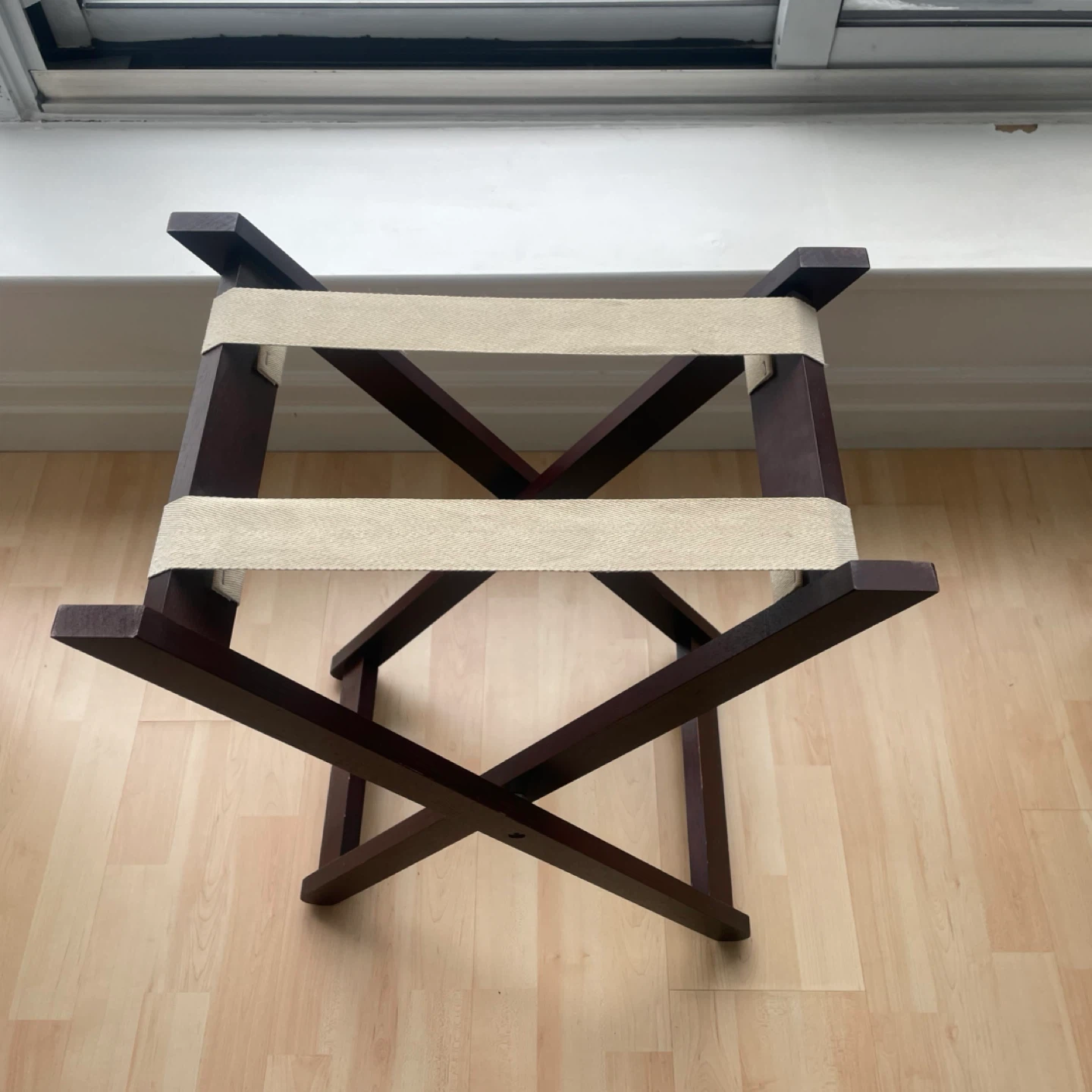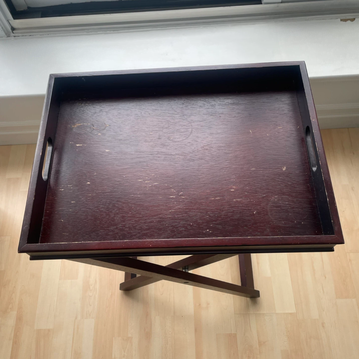A dark wood finish folding tray table or side table. It's perfect for holding or serving drinks or snacks or decorative items.
