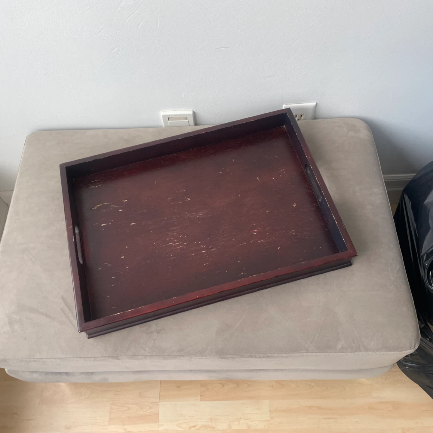 Vintage Dark Solid Wood Serving Tray Table with Folding Stand