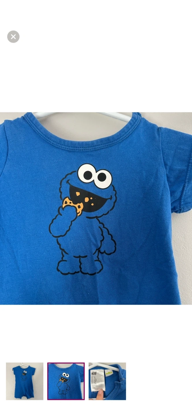 H&M brand. Shirt sleeve shorts romper. Blue in colour with Cookie Monster graphic. Size 2/4m. Brand new condition