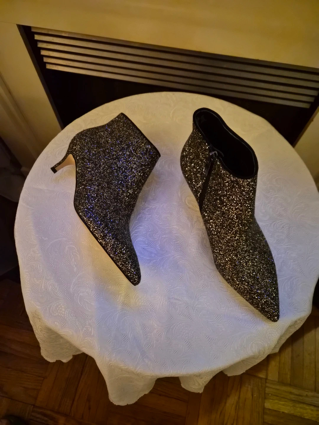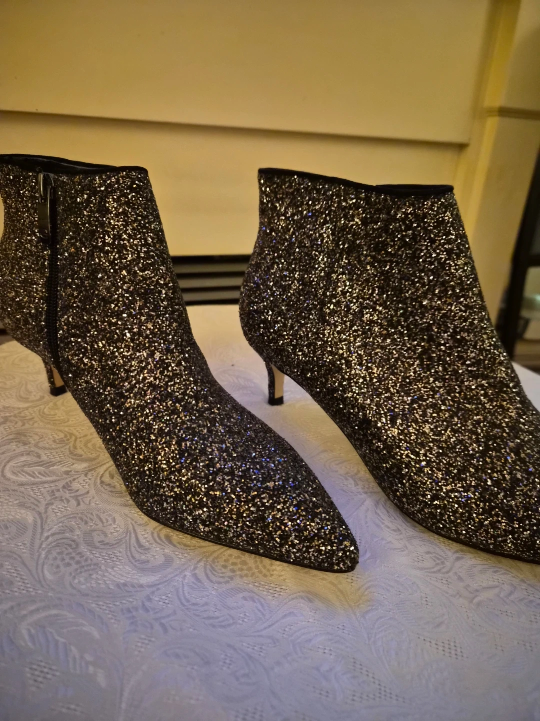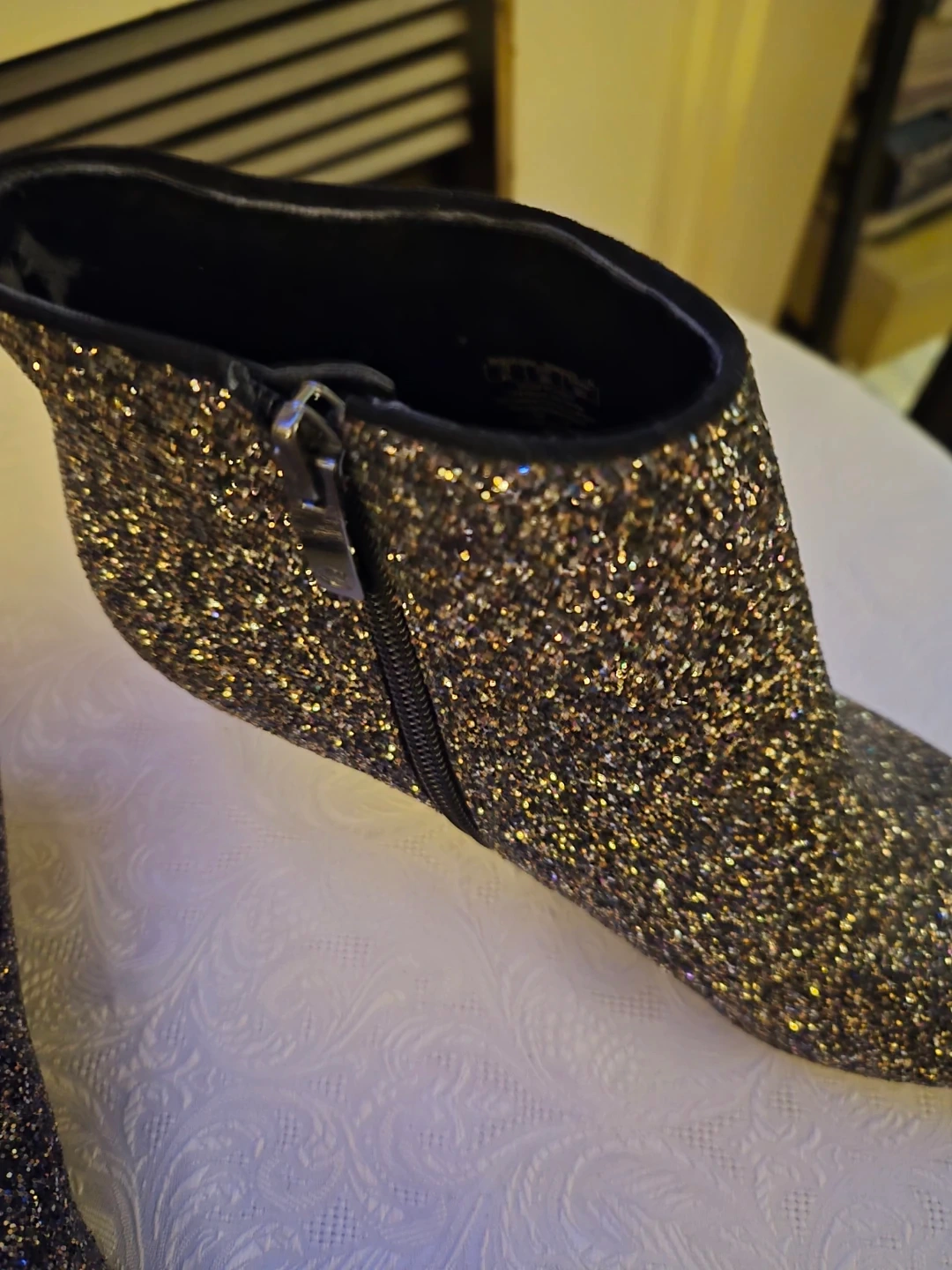 These Deryna ankle boots are covered in sparkly glitter. They feature a side zipper for easy on and off.