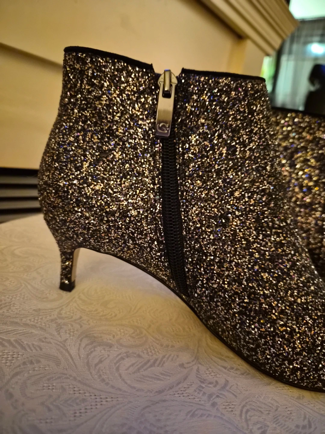 These Deryna ankle boots are covered in sparkly glitter. They feature a side zipper for easy on and off.