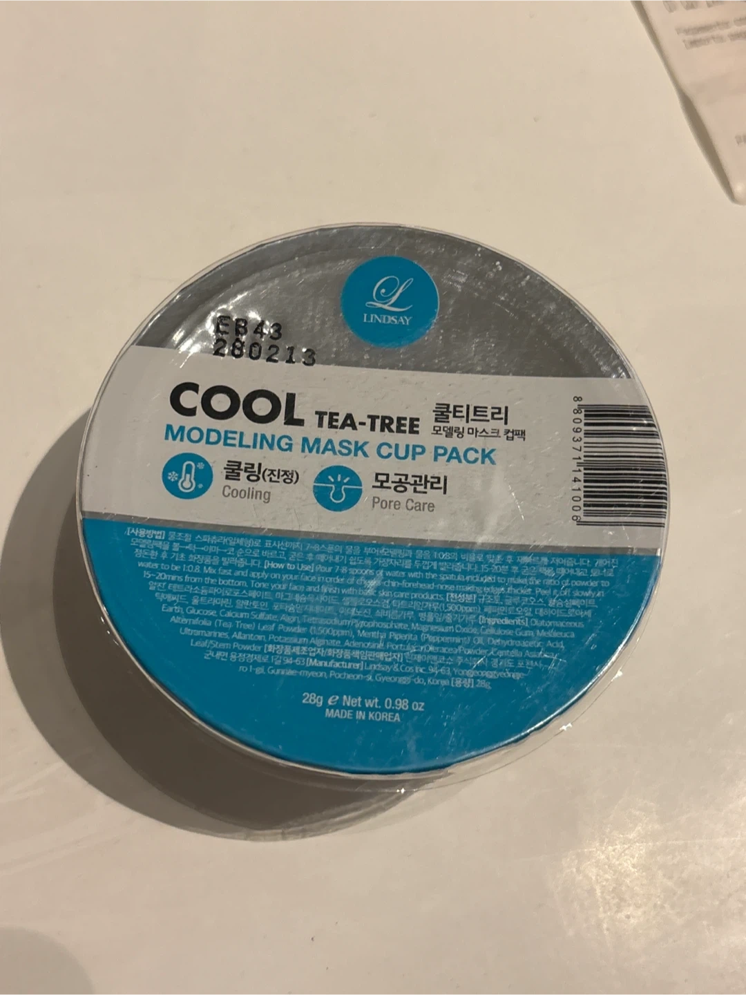Here's a Cool Tea-Tree Modeling Mask Cup Pack. It's great for cooling and pore care. The pack contains 28g of product and is made in Korea. It's a modelling mask cup pack. Easily mix with water for and apply to face.