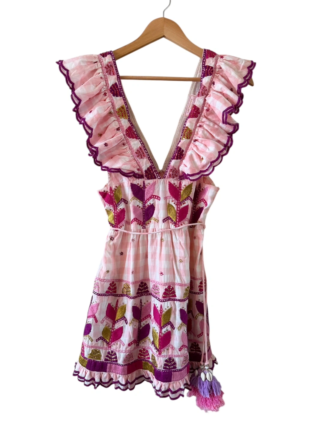 Adorable pink gingham mini dress featuring ruffled shoulders and colourful embroidered leaf details. It has a tie waist with tassels and a tiered skirt. Perfect for summer days!