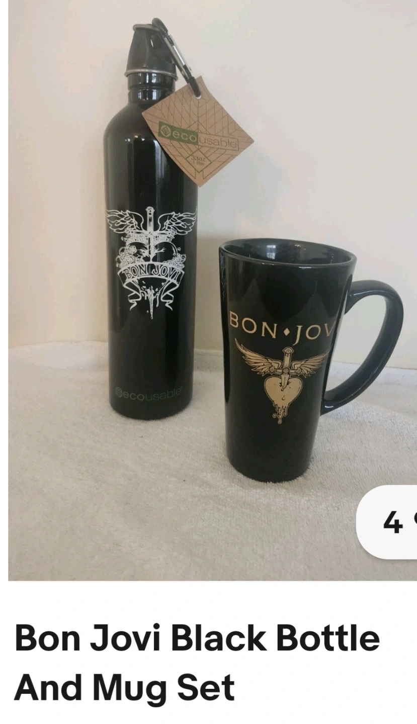 This is a black bottle and mug set featuring Bon Jovi branding. The bottle is 33oz (1 liter) and includes a carabiner clip. It's a cool set for any fan!
