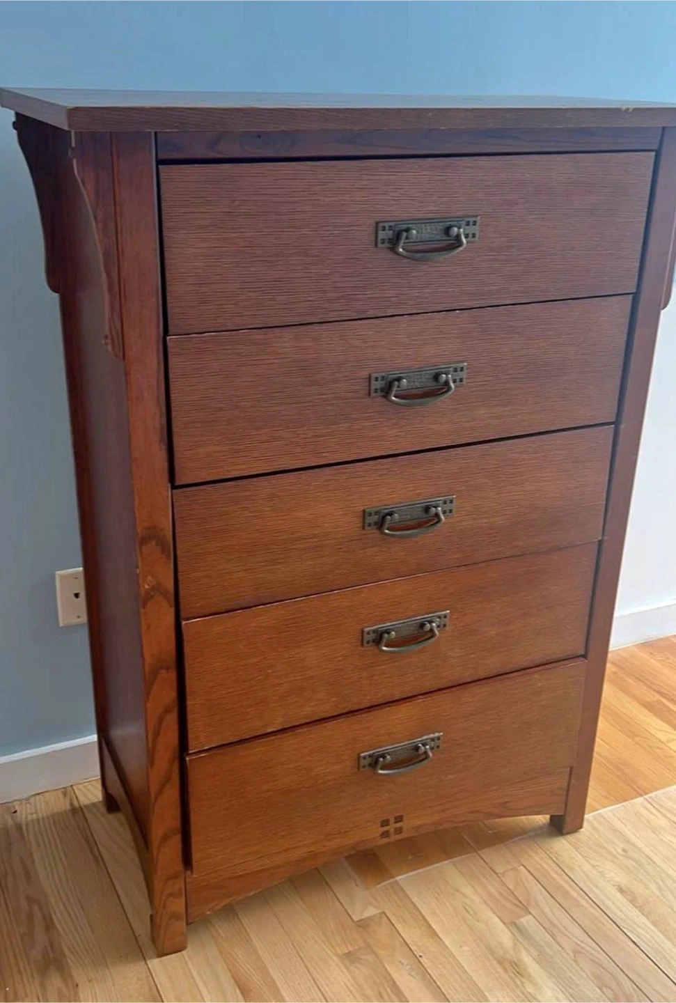 A 5-drawer dresser made of wood. It has dark metal drawer pulls and a warm brown finish. This dresser offers ample storage space for clothes or linens.
