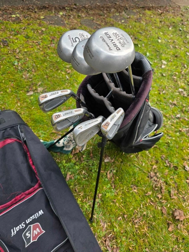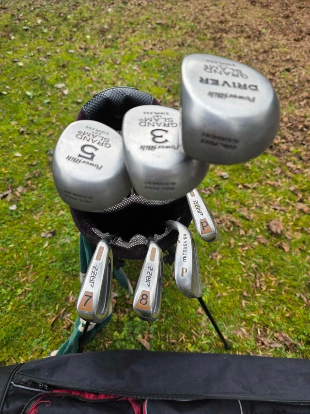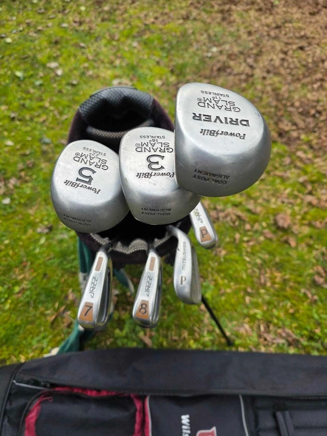 Selling a PowerBilt Grand Slam golf set! This used set includes a driver, 3 and 5 woods, and 7, 8, 9, and Pitching Wedge irons. The clubs are in fair condition. There is a Wilson Staff travel bag included. PowerBilt Grand Slam woods, PowerBilt Jazz irons, Wilson Staff Travel Bag. I'm selling this for $60. If the ad is up, then it's available!