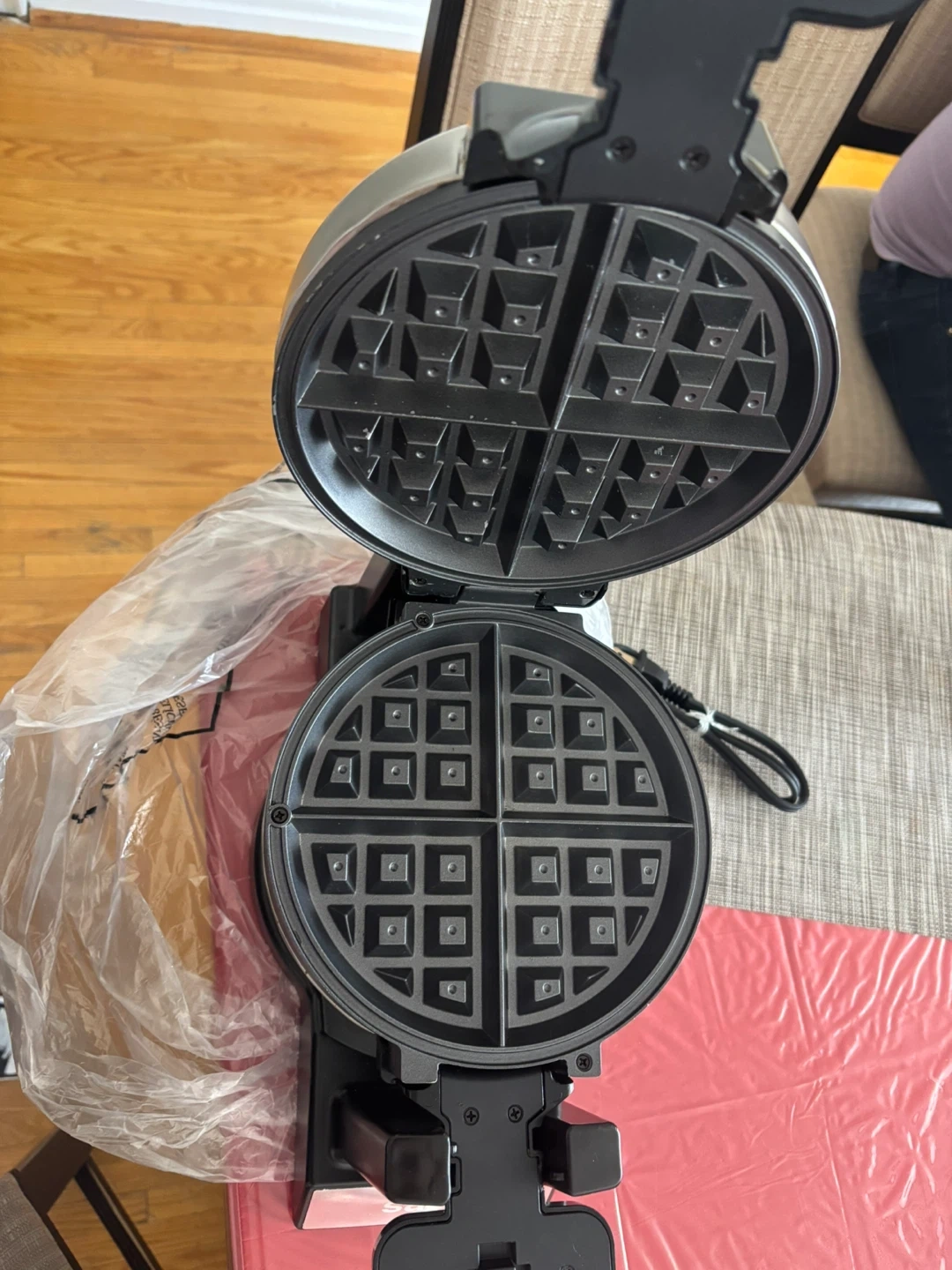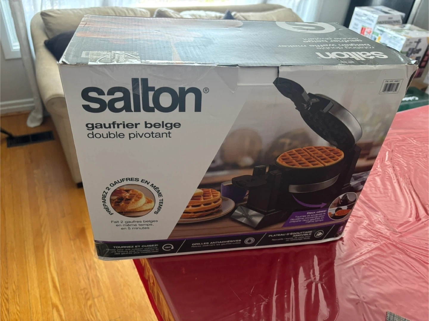This is a Salton Belgian waffle maker. It features a non-stick coating for easy cleanup. The rotating design makes for even cooking.