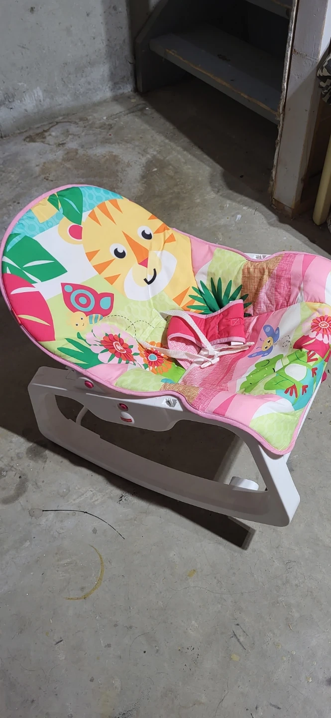 This Fisher-Price baby bouncer seat features a colourful jungle animal design. It has a secure harness and a gentle bouncing motion. It's perfect for keeping your little one entertained and comfortable.