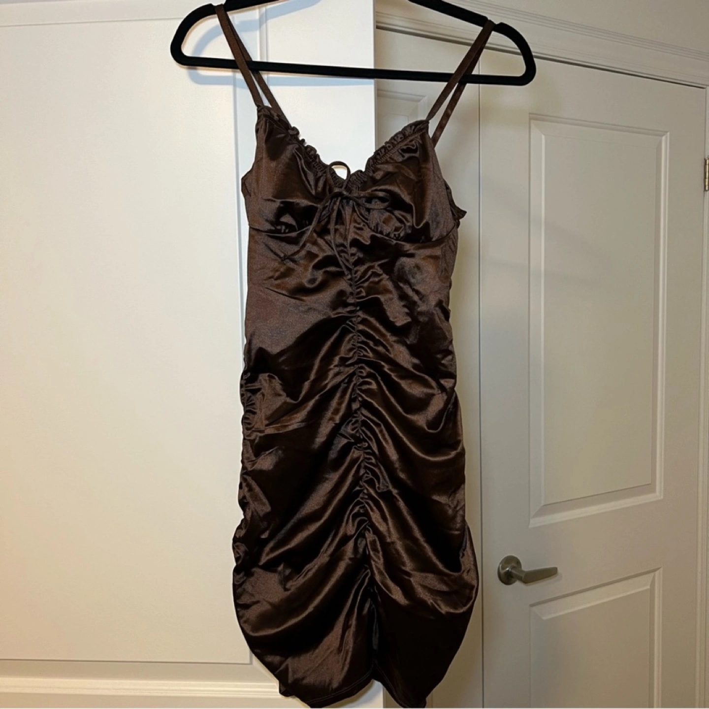Short, fitted dress in soft, draped jersey. Narrow shoulder straps, low-cut, elasticized sweetheart neckline with ruffle trim at top and a bow at front.