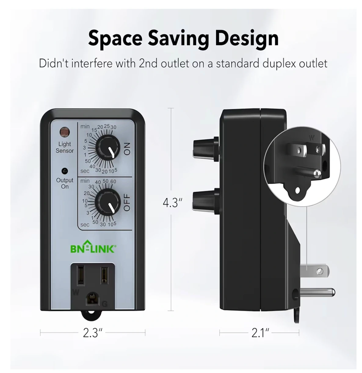 This is a BN-LINK short period repeat cycle timer. It's designed for energy saving applications. The timer allows for customizable ON and OFF intervals, ranging from 5 seconds to 60 minutes. It also features a light sensor for added functionality.