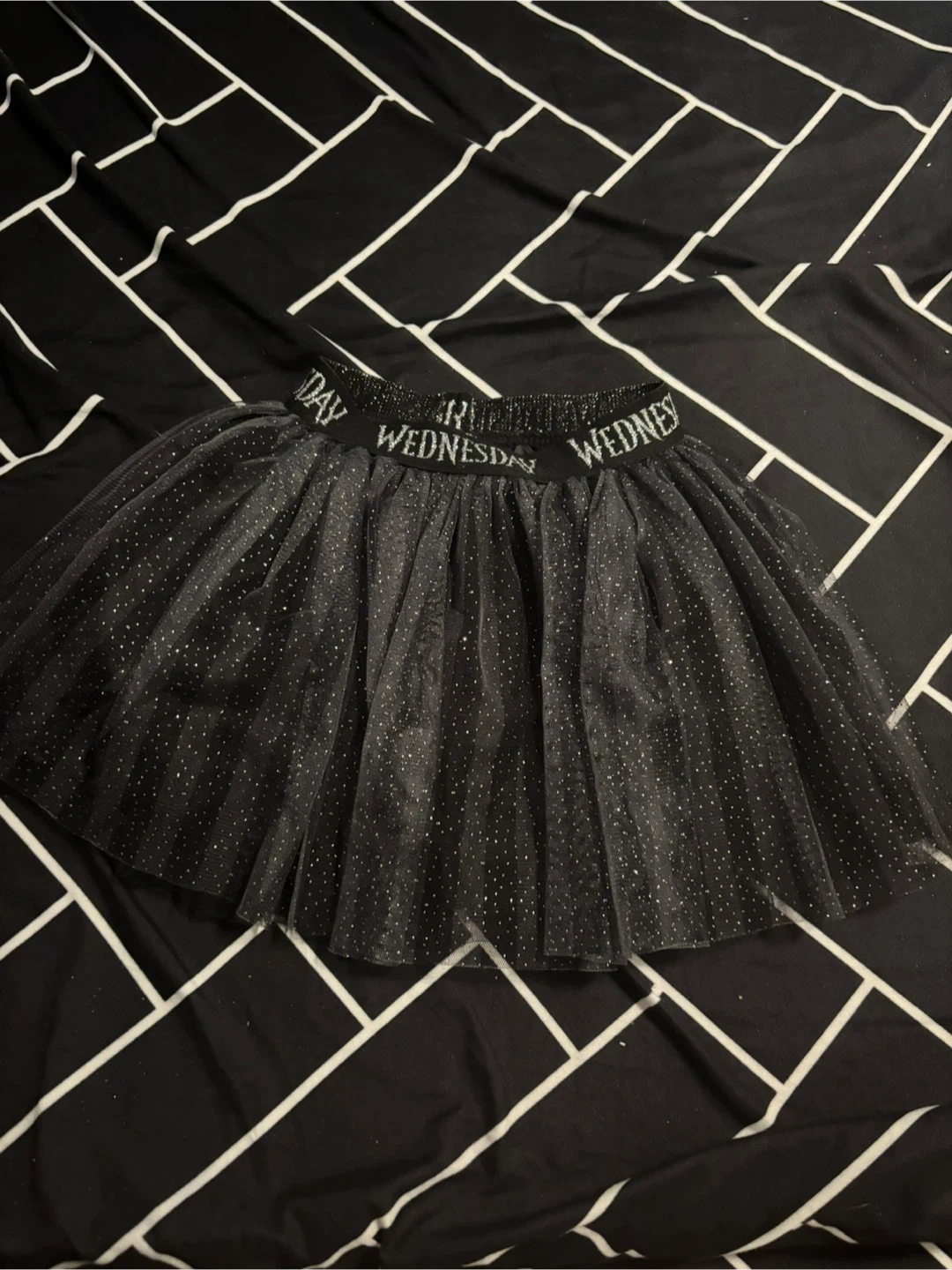 This Mad Engine black tutu skirt features a glittery design with "Wednesday" repeated on the elastic waistband. It's made of 100% polyester. Great for kids aged 4-5 years old!