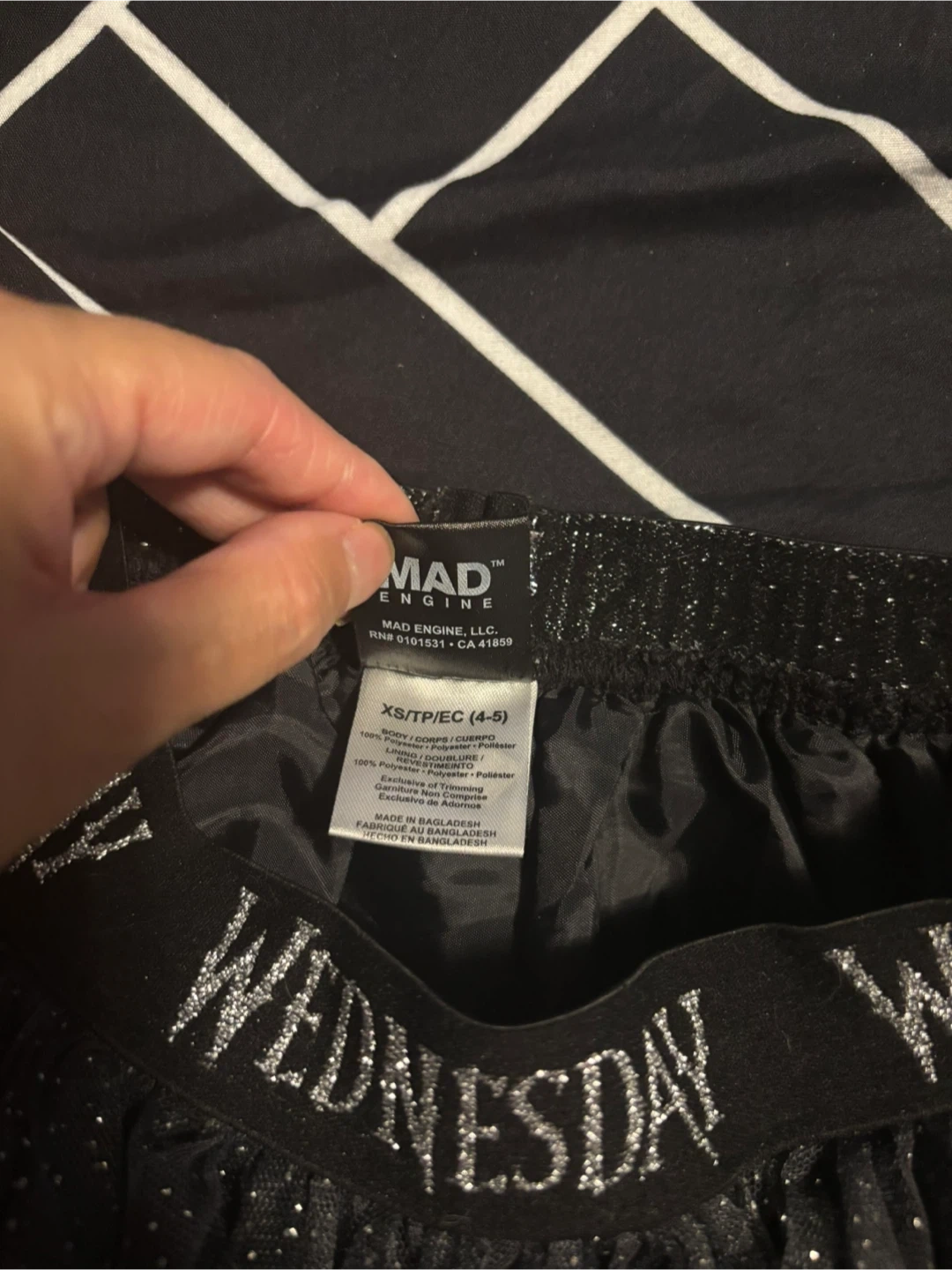 This Mad Engine black tutu skirt features a glittery design with "Wednesday" repeated on the elastic waistband. It's made of 100% polyester. Great for kids aged 4-5 years old!