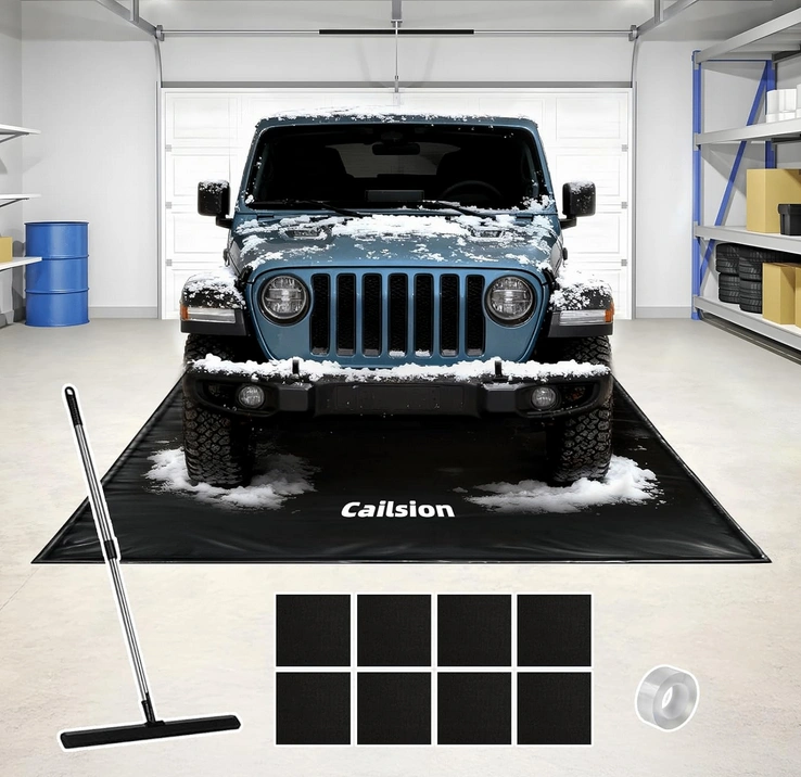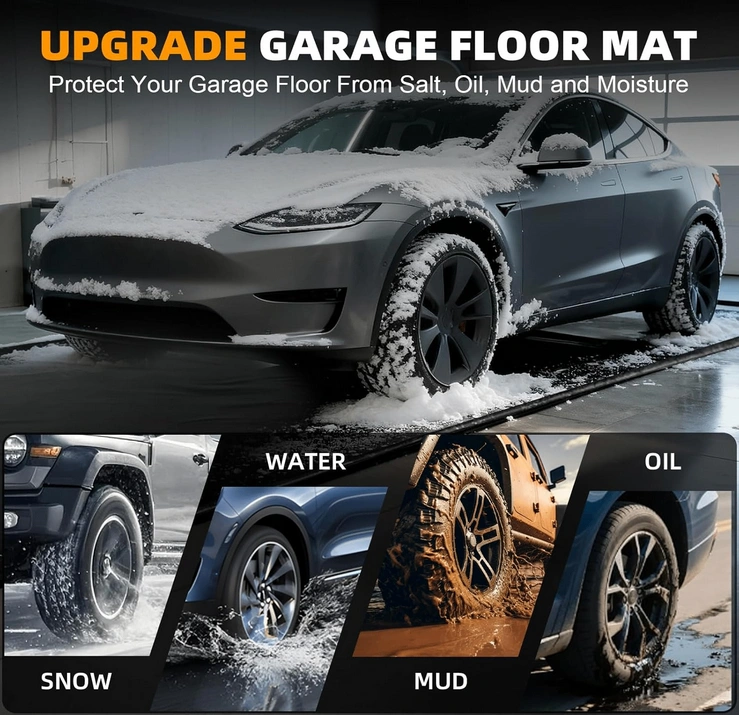 This is a heavy-duty containment mat designed to protect your garage floor from melting snow, slush, rainwater, mud, oil, and chemical drips. It has raised edges (about 1.2 inches high) that act like a barrier, keeping all the mess contained on the mat instead of spreading across your garage.